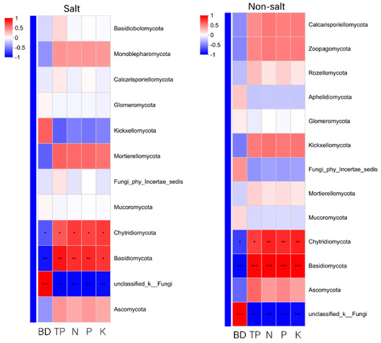 At the phylum level, Chytridiomycota and Basidiomycota were significantly positively correlated with total porosity, total nitrogen, total phosphorus, and total potassium, and significantly negatively correlated with bulk density under saline or non-saline conditions (Figure 9).