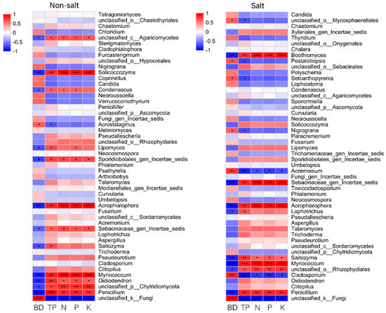At the genus level, Penicillium, Oidiodendron, Myriococcum, Acrophialophora, and Solicoccozyma were significantly positively correlated with total porosity, total nitrogen, total phosphorus, and total potassium, and significantly negatively correlated with bulk density under non-salt conditions. Condenascus was significantly positively correlated with total porosity, total nitrogen, and total phosphorus, and significantly negatively correlated with bulk density. Acrostalagmus was significantly negatively correlated with total porosity and significantly positively correlated with bulk density. Lipomyces were significantly positively correlated with total porosity and total phosphorus and significantly negatively correlated with bulk density. Saitozyma was significantly positively correlated with total porosity and significantly negatively correlated with bulk density.