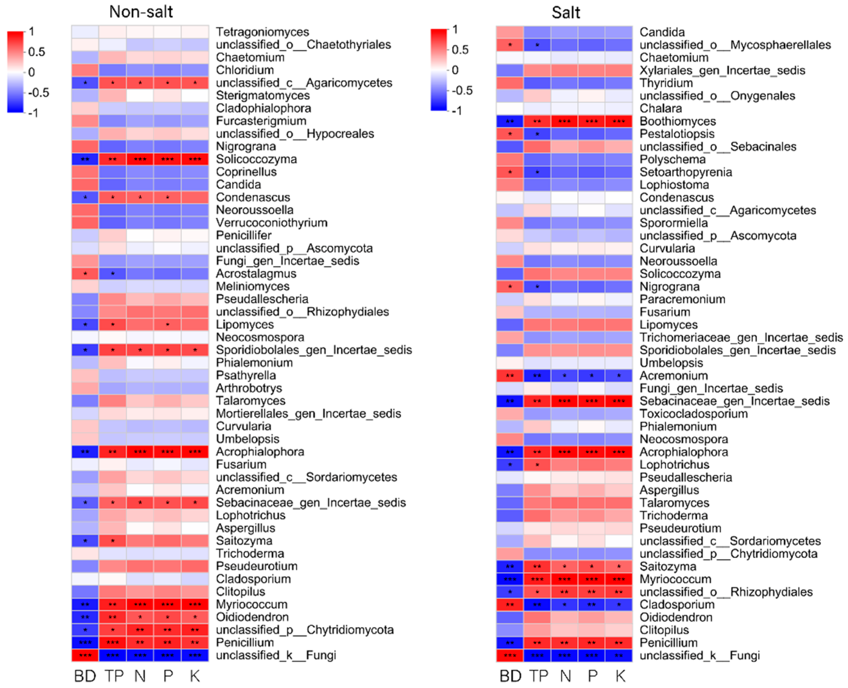- Yuan, M.; Zhang, D.; Wang, Z.; Zhu, Z.; Sun, H.; Wang, W.; Han, D.; Qu, Z.; Ma, B.; Wang, J. Salt altered rhizosphere fungal community and induced soybean recruit specific species to ameliorate salt stress. Front. Microbiol. 2023, 14, 1142780. [Google Scholar] [CrossRef]