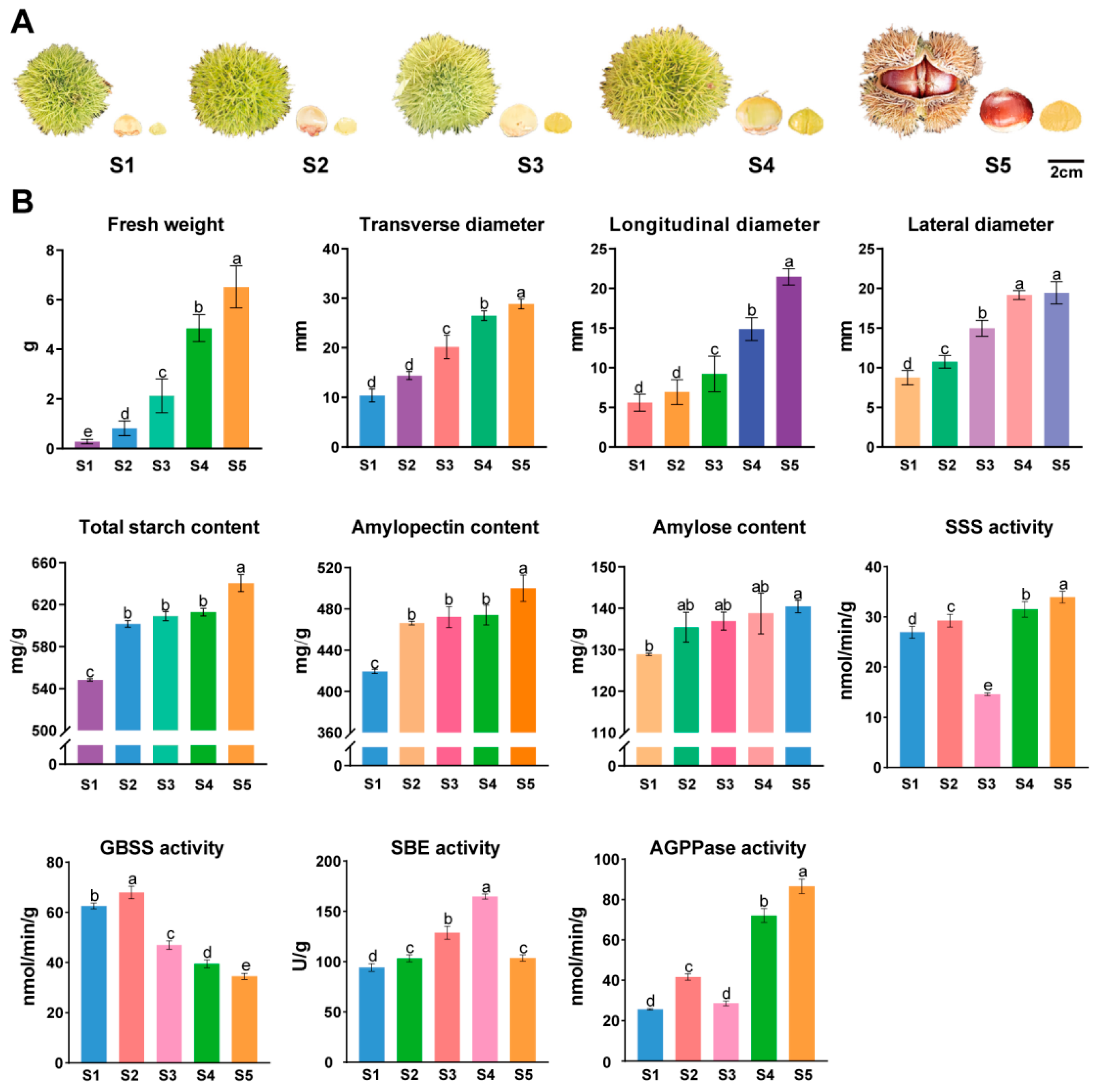 - Li, S.; Shi, Z.; Zhu, Q.; Tao, L.; Liang, W.; Zhao, Z. Transcriptome sequencing and differential expression analysis of seed starch accumulation in Chinese chestnut Metaxenia. BMC Genom. 2021, 22, 617. [Google Scholar] [CrossRef]