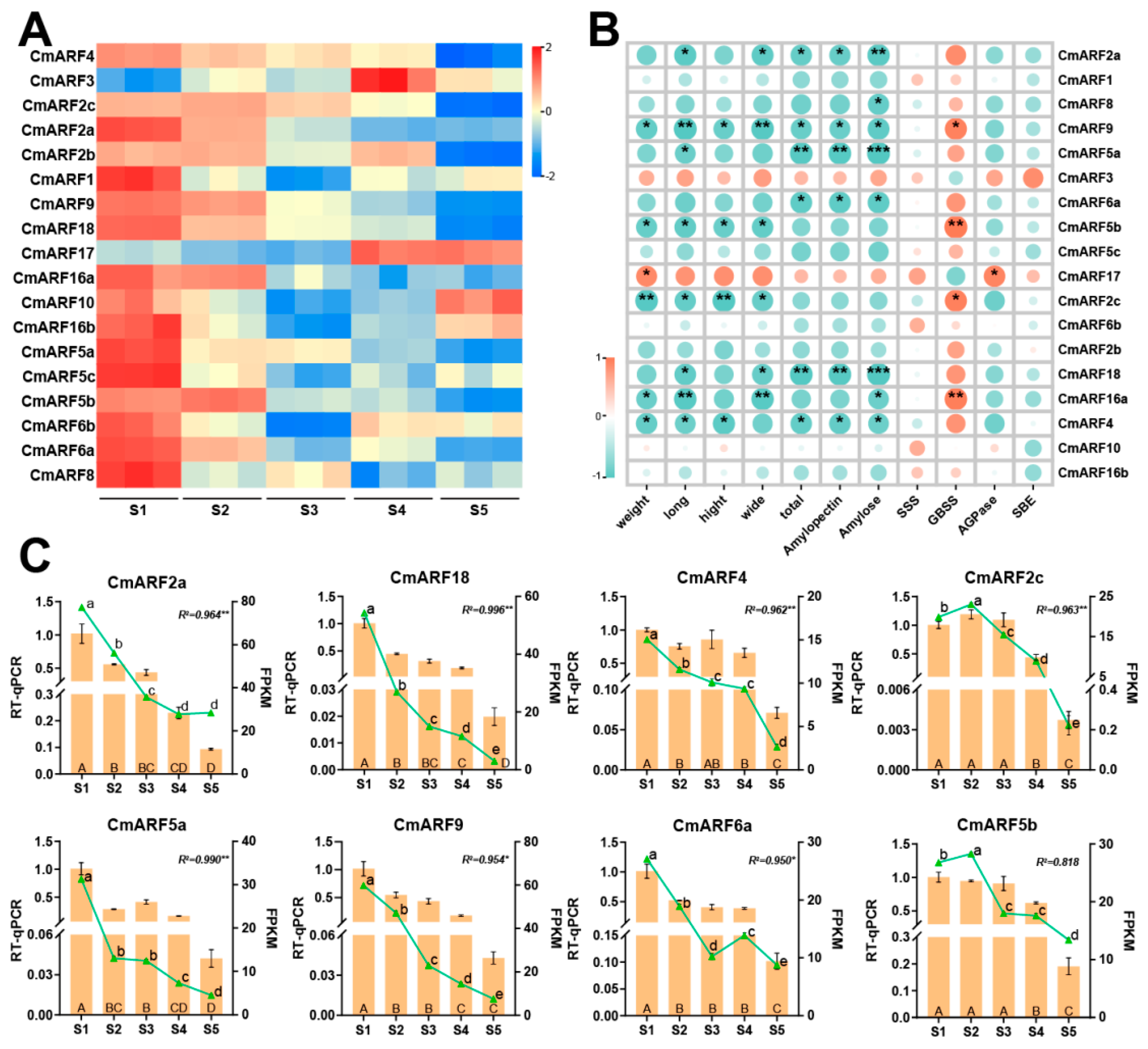 3.9. Correlation Between CmARF Genes and Phenotypic Indicators, and RT-qPCR Validation