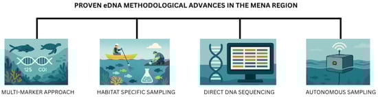 Beyond fish, eDNA methods have been successfully applied to a wide range of marine taxa. It has enabled detection of non-indigenous invertebrates, including arthropods, mollusks, and Polychaete worms [63], as well as invasive ascidian species [64] and colonial tunicates [65]. The method has also proven effective for monitoring endangered species such as the sea cucumber Holothuria scabra [66] and for assessing native biodiversity [67]. Collectively, these studies underscore the value of eDNA methods as a comprehensive tool for biodiversity monitoring and environmental assessment across trophic levels [64,68,69,70]. As the technique continues to advance, its integration with traditional monitoring approaches will further enhance our ability to track and manage marine biodiversity, including in data-limited regions such as the MENA.