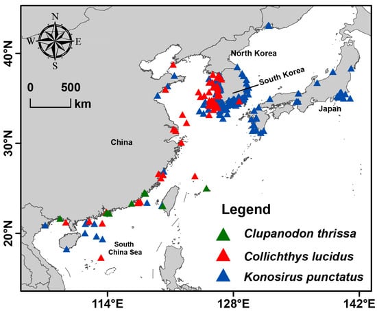 In Asia, particularly in East Asia, numerous fish species are of substantial economic and ecological importance but are increasingly threatened by the impacts of climate change []. Among these species are Collichthys lucidus (Richardson, 1844), Clupanodon thrissa (Linnaeus, 1758), and Konosirus punctatus (Temminck & Schlegel, 1846), which are commercially valuable trawl-caught fish in East Asian fisheries [,,]. These species not only contribute to regional food security but also play critical ecological roles by occupying intermediate trophic levels as planktivorous consumers and serving as essential prey for higher predators such as the Pacific humpback dolphin (Sousa chinensis Osbeck, 1765) in marine ecosystems [,,]. However, their populations are currently in decline due to overfishing and ecosystem degradation []. Biologically, C. lucidus is a small demersal fish of the family Sciaenidae that inhabits coastal benthic zones. It matures at around 80 mm, lives up to three years, and is an economically valuable species across East Asia [,,]. In contrast, C. thrissa and K. punctatus are pelagic members of the family Clupeidae, both with lifespans of up to five years, and contribute significantly to regional fisheries [,]. Despite their ecological and economic importance, studies on the impacts of climate change on these species in Asia remain limited [,].