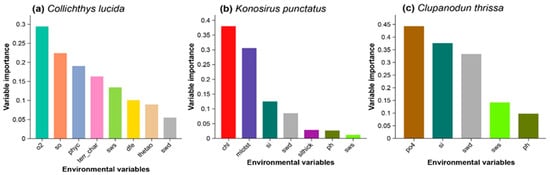 The final models for the focal species were constructed using species-specific sets of environmental variables, selected after multicollinearity analysis (Figure 2; Tables S1 and S2). The relative contribution of these variables varied considerably among the three focal species (Figure 2). For C. lucidus, dissolved oxygen (O2) and salinity (SO) were the most influential predictors. In contrast, chlorophyll-a concentration (Chl) and mixed layer depth (Mlotst) were the strongest predictors for K. punctatus, whereas phosphate (PO4) and silicate (Si) were the most influential variables in the distribution model of C. thrissa.