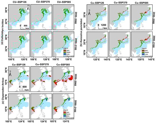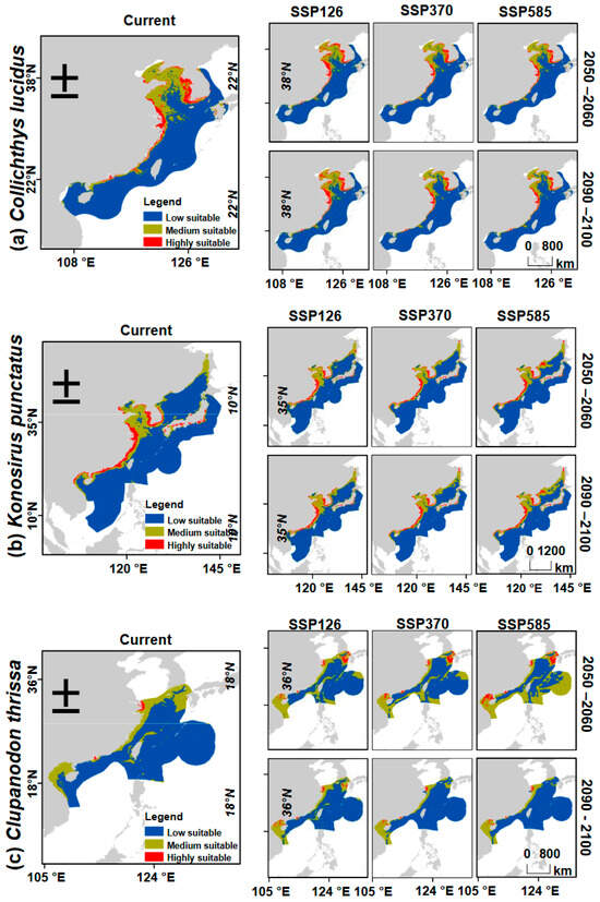Shifts in the distribution ranges of the three focal fish species under different climate scenarios (a) Collichthys lucidus, (b) Konosirus punctatus, and (c) Clupanodun thrissa. The three future scenarios are SSP126, SSP370, and SSP585 for the years 2050–2060 and 2090–2100.