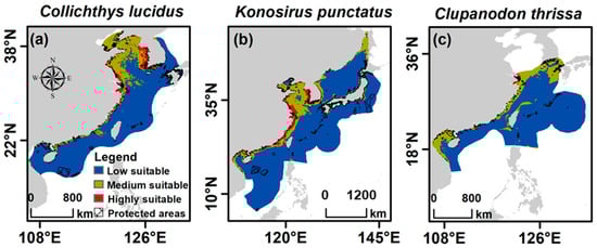 The highly suitable habitats for the three focal fish species were identified along the coastlines of the countries they inhabit. However, these regions fall within national exclusive economic zones (EEZs), leaving the species vulnerable to anthropogenic pressures such as overfishing, pollution, shipping, and coastal development. Our conservation gap analysis further underscores this vulnerability, revealing that only 7%, 2%, and 6% of the total distributional ranges of C. lucidus, C. thrissa, and K. punctatus, respectively, are currently covered by MPAs. This finding aligns with previous studies showing that MPAs often fail to adequately protect marine species and remain insufficient to address the impacts of climate change []. Although the global extent of MPAs has increased in recent years [], significant shortfalls persist in meeting the 2030 targets of the Kunming–Montreal Global Biodiversity Framework. To effectively conserve our focal fish species and other pelagic and benthic taxa in the region, there is a need to expand and reconfigure existing MPAs to better encompass highly suitable habitats, strengthen legal enforcement and market regulation to curb unsustainable exploitation, adopt transboundary conservation strategies that account for species’ distributions across the EEZs of China, Korea, Japan, and Vietnam, and raise public awareness of the ecological and economic importance of conserving these species to sustain biodiversity.