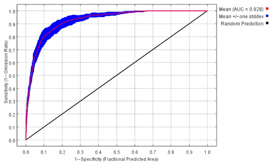 Model performance was evaluated using the area under the receiver operating characteristic curve (AUC). AUC values > 0.9 indicate excellent predictive performance [33,34]. Variable importance was assessed using the built-in Jackknife test and response curves.