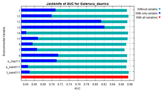 These top predictors contributed a cumulative 71.8% to the model. Other relevant variables included subsoil clay content (6.1%) and topsoil sand content (4.8%), which is consistent with the widespread distribution of sandy soils in Central–Western Inner Mongolia. Jackknife analyses further confirmed the critical role of bio13 and bio12, both achieving AUC values > 0.8 when used in isolation (Figure 2, Table S4).