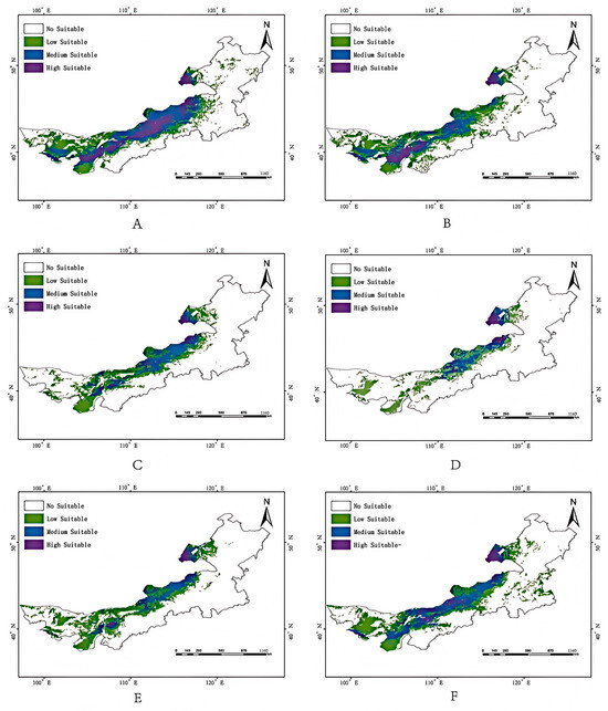 Figure 5. Potential suitable habitat distribution of Galeruca daurica in Inner Mongolia under future climate scenarios. (A,B) SSP1-2.6 for the 2050s and 2070s, respectively; (C,D) SSP2-4.5 for the 2050s and 2070s, respectively; (E,F) SSP5-8.5 for the 2050s and 2070s, respectively.