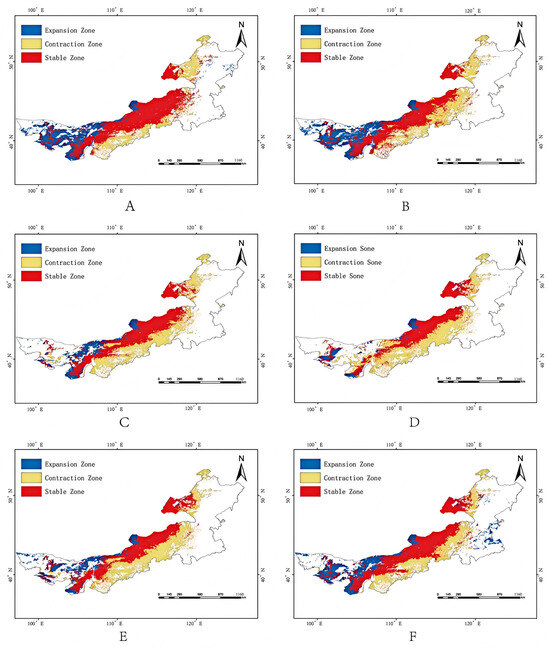 Figure 6. Spatial changes in the suitable habitat of Galeruca daurica under future climate scenarios compared to the current distribution. (A,B) SSP1-2.6 for the 2050s and 2070s, respectively; (C,D) SSP2-4.5 for the 2050s and 2070s, respectively; (E,F) SSP5-8.5 for the 2050s and 2070s, respectively.