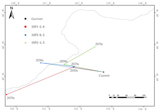 Centroid shift trajectory of Galeruca daurica suitable habitats under future climate scenarios.