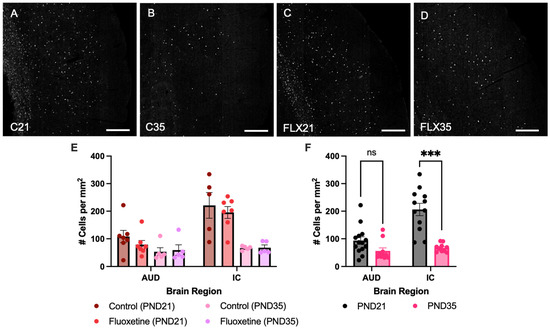 Myelin-associated glycoprotein positive cells in the auditory cortex and inferior colliculus. Myelin-associated glycoprotein (MAG)-stained brain sections containing the auditory cortex for control rats at PND21 and PND35 ((A,B), respectively), and fluoxetine-treated rats at PND21 and PND35 ((C,D), respectively). Scale bar = 333 μm, C = control, FLX = fluoxetine, PND = postnatal day. MAG+ cell counts are presented for both treatment groups individually (E) and for the treatment groups averaged together (F). # = number of cells, AUD = auditory cortex, IC = inferior colliculus, ns = not significant, and *** = p ≤ 0.001.