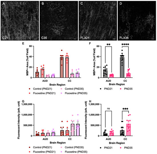 Myelin basic protein positive area and fluorescent intensity in the auditory cortex and corpus callosum. Myelin basic protein (MBP)-stained brain sections containing the auditory cortex for control rats at PND21 and PND35 ((A,B), respectively), and fluoxetine-treated rats at PND21 and PND35 ((C,D), respectively). Scale bar = 20 μm, C = control, FLX = fluoxetine, PND = postnatal day. MBP+ area is presented for both treatment groups individually (E) and for the treatment groups averaged together (F). Analysis of fluorescent intensity of MBP was also performed in both treatment groups individually (G) and for the treatment groups averaged together (H). AUD = auditory cortex, CC = corpus callosum, ns = not significant, ** = p ≤ 0.01, *** = p ≤ 0.001 and **** = p ≤ 0.0001.
