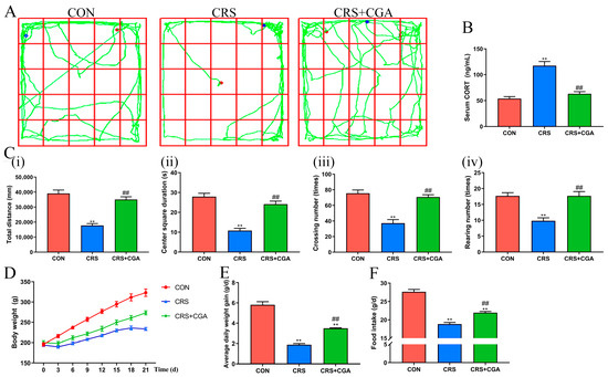 Effect of CGA on chronic stress in rats. (A). The movement trajectory of rats. The red dots indicated the starting point, and the blue dots indicated the ending point (B). The level of serum CORT. (C). The results of total distance (i), center square duration (ii), crossing number (iii), and rearing number (iv). (D). Body weight changes in rats. (E). Average daily weight gain of rats. (F). Feed intake of rats. ** p < 0.01 vs. CON group. ## p < 0.01 vs. CRS group.