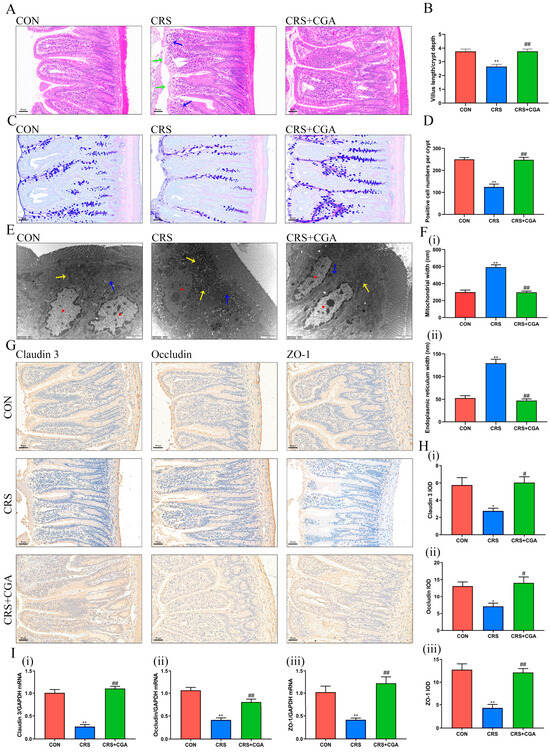 Effect of CGA on the structure of the rat ileum. (A). The HE staining of the ileum. Green arrows indicated epithelial cell detachment and blue arrows indicated inflammatory cell infiltration. (200×, Bar: 50 μm). (B). The ratio of intestinal villus length to crypt depth. (C). The AB-PAS staining of the ileum. (200×, Bar: 50 μm). (D). The analysis of AB-PAS staining. (E). Ultrastructural changes in the rat ileum. Yellow arrows indicated mitochondria, blue arrows indicated TJ, and red stars indicated nuclei. (10,000×, Bar: 2 μm). (F). The analysis of mitochondrial (i) and endoplasmic reticulum width (ii) (G). Representative images of Claudin 3 IHC, Occludin IHC, and ZO-1 IHC. (200×, Bar: 50 μm). (H). The analysis of Claudin 3 IHC (i), Occludin IHC (ii), and ZO-1 IHC (iii). (I). The mRNA levels of Claudin 3 (i), Occludin (ii), and ZO-1 (iii). * vs. CON group, # vs. CON group. *, # p < 0.05. **, ## p < 0.01.