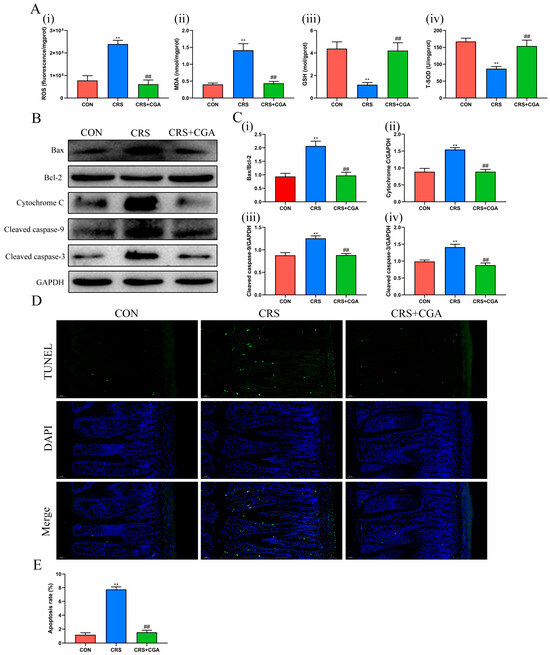 Effect of CGA on oxidative stress and apoptosis in the ileum. (A). The levels of ROS (i), MDA (ii), GSH (iii), T-SOD (iv). (B). Representative blots of Bax, Bcl-2, Cyt C, cleaved caspase-9, cleaved caspase-3. (C). The levels of Bax/Bcl-2 (i), Cyt C (ii), cleaved caspase-9 (iii), cleaved caspase-3 (iv). (D). Representative images of TUNEL assay in ileum. (200×, Bar: 50 μm). (E). The analysis of TUNEL assay in ileum. ** p < 0.01 vs. CON group, ## p < 0.01 vs. CON group. The uncropped western blot figures were presented in Figure S1.