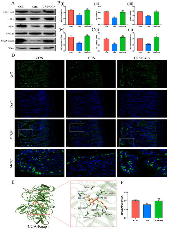 Effect of CGA on the Nrf2 pathway in the ileum. (A). Representative blots of Nrf2, HO-1, and NQO1. (B). The levels of Nrf2 (Total) (i), HO-1 (ii), NQO1 (iii), and Nrf2 (Nuclear) (iv). (C). The mRNA levels of HO-1 (i), and NQO1 (ii). (D). Representative images of Nrf2 localization in ileum (200× and Bar: 50 μm; 400× and bar: 20 μm). (E). Molecular docking mode of CGA with Keap 1. (F). The mRNA levels of Nrf2. ** p < 0.01 vs. CON group, ## p < 0.01 vs. CON group. The uncropped western blot figures were presented in Figure S1.