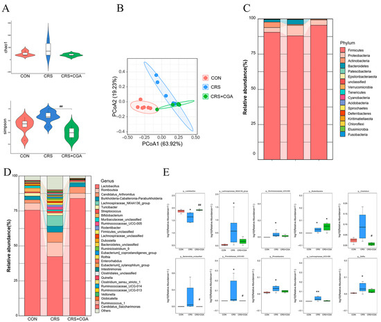We investigated the effect of CGA on microbiota and its impact on chronic stress-induced ileal damage. We analyzed variations in microbial composition within the ileum using 16S rRNA sequencing. Simpson’s index showed a significant decrease in the CGA group compared to the CRS group (p < 0.01), indicating that CGA lowered the increased alpha diversity of ileal flora in the CRS group (Figure 5A). Principal coordinates analysis (PCoA) based on weighted UniFrac distances displayed distinct clustering of microbiota among the groups. The weighted UniFrac distances demonstrated notable differences across the three groups, suggesting that both CGA and chronic stress modified the beta diversity of ileal flora (Figure 5B). The dominant phyla in the ileum included Firmicutes, Proteobacteria, Actinobacteria, and Bacteroidetes (Figure 5C). Additionally, Lactobacillus, Romboutsia, Candidatus_Arthromitus, Burkholderia-Caballeronia-Paraburkholderia, and Lachnospiraceae_NK4A136_group constituted the prominent genera (Figure 5D). When compared to CON group, Lactobacillus abundance decreased (p < 0.05), while Clostridium, Lachnospiraceae_NK4A136_group, Ruminococcaceae_UCG-005, Phreatobacters, Rodentibacter, unclassified Bacteroidota, Prevotellaceae_UCG-003, Lachnospiraceae_UCG-008, and Delftia increased in the CRS group (p < 0.05). In contrast, the CGA group exhibited elevated Lactobacillus levels compared to the CRS group (p < 0.01), while unclassified Bacteroidota, Prevotellaceae_UCG-003, and Clostridium abundance diminished (p < 0.05) (Figure 5E).