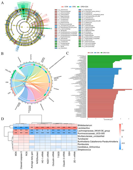 Linear discriminant analysis effect size (LEfSe) revealed notable differences in microbiota across the three groups. The distinctive flora in the CON group included Actinomyces, Enterorhadbus, Bergeyella, Allobaculum, and Dubosiella. Conversely, the CRS group displayed Prevotellaceae_UCG_003, Helicobacter, Clostridium, Acetatifactor, Lachnospiraceae_UCG_008, Ruminococcaceae_UCG_005, Anaerotruncus, and Rodentibacter (Figure 6A,C). Meanwhile, the CGA group was characterized by Lactobacillus, Faecalibacterium, Citrobacter, and Akkermansia.
