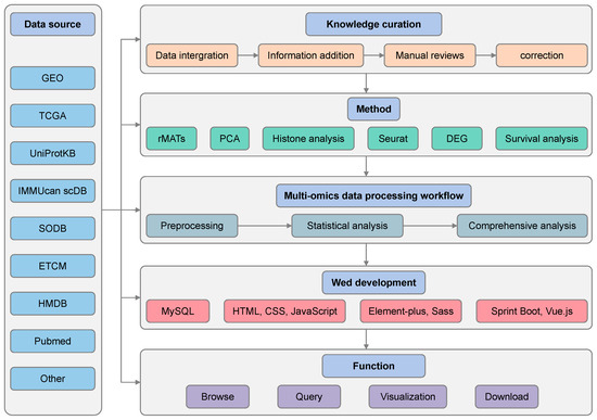 Genomics information associated with gastric diseases was retrieved from online databases including http://www.licpathway.net/ATACdb/ (Chromosome structure, accessed on 5 August 2023), https://ngdc.cncb.ac.cn/methbank/ (DNA methylation), https://www.encodeproject.org/ (Histone modification, accessed on 10 October 2023), https://www.cbioportal.org/ (Copy number alteration genes, mutated genes, structural variant genes, accessed on 12 November 2023), https://www.ncbi.nlm.nih.gov/snp/ (Single-nucleotide polymorphisms, SNPs, accessed on 28 November 2023), and https://www.omim.org/ (Online Mendelian Inheritance in Man, OMIM, accessed on 3 December 2023) [29,30,31,32,33]. Metabolomics data were downloaded from https://hmdb.ca/metabolites/ (accessed on 3 June 2024), where the search terms “gastric”, “stomach”, “stomach cancer” and “gastric cancer” were used to identify metabolites experimentally associated with gastric tissues or gastric diseases [34]. Proteomics data were obtained from https://www.uniprot.org/ (accessed on 10 March 2024), using the advanced search query ‘organism: Homo sapiens OR Mus musculus AND keyword: “gastric” OR “stomach” to collect protein entries linked to gastric tissues or gastric disease pathways. Each protein entry was extracted along with its gene name, protein name, function, and post-translational modification information, pubmed ID, etc. [35]. Treatment-related information for gastric diseases was collected from https://ctdbase.org/ (Chemical compounds, accessed on 15 March 2024) and http://www.tcmip.cn/ETCM/index.php/Home/Index/index.html (Chinese medicine, accessed on 3 September 2024) [36,37].