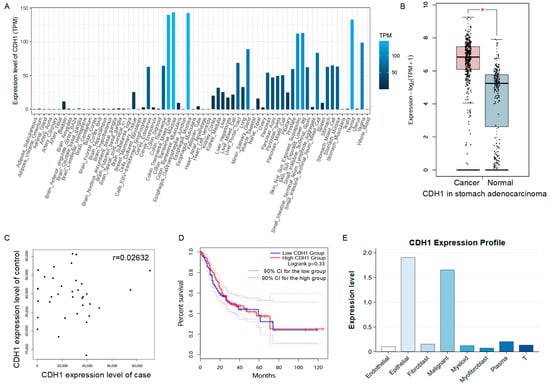 Main features and data modules of the StomachDB platform. (A) Expression levels of the CDH1 gene across different human tissues, based on data from the GTEx project. (B) Differential expression of CDH1 between gastric cancer tissues and adjacent normal tissues. * indicates statistical significance (p < 0.05). (C) Correlation analysis of CDH1 expression between gastric cancer and normal tissues. The x-axis represents CDH1 expression levels in cancer tissues, and the y-axis in normal tissues. Original data were obtained from the GEO database. “r” refers to the correlation coefficient. (D) Survival analysis of CDH1. Patients were divided into high- and low-expression groups based on the median CDH1 expression level. The dashed line represents the 95% confidence interval (CI). (E) Expression landscape of CDH1 across different cell types in gastric cancer tissues, derived from scRNA-seq data. The x-axis represents different cell clusters, and the y-axis shows the corresponding CDH1 expression levels.