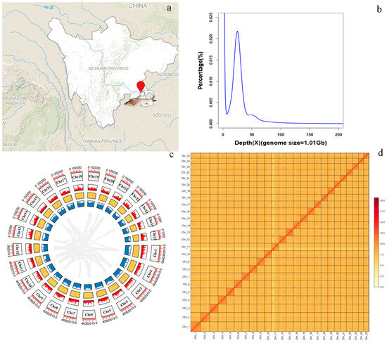 Chromosome-level genome assembly of R. ventralis. (a) Geographic map of the sample collection site (indicated by a red symbol). (b) K_mer (17-mer) distribution for the genome-size estimation. (c) Genomic features of the 25 chromosomes. From the outer to the inner rings include chromosomes, gene distribution, GC content (a yellow-to-red color gradient represents increasing GC-content), repeat elements, and collinear blocks among each chromosome. (d) Genome-wide chromatin interactions at a 1000-kb resolution in the 25 chromosomes. Color blocks represent the interactions, with various strengths from yellow (low) to red (high).