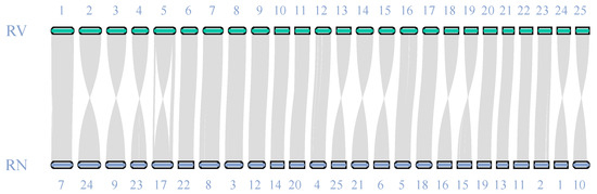 Chromosomal collinearity analysis revealed strong genomic synteny between the R. ventralis (RV) and R. nasutus (RN) genomes (Figure 2). All the 25 chromosomes displayed one-to-one synteny between the two relative species, validating the high quality and completeness of our R. ventralis assembly (Figure 1c) established in this study.