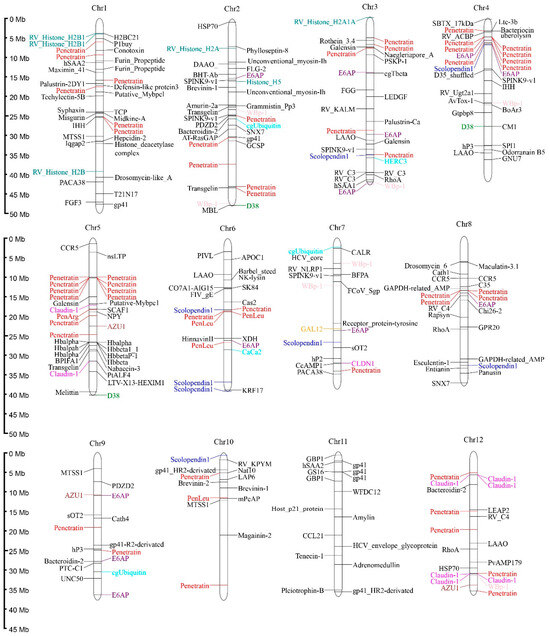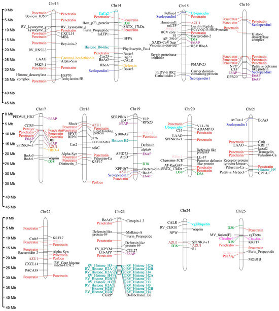 Predicted AMPs were widely distributed across the 25 chromosomes of R. ventralis, with Chr 1–4 and 23 each containing ≥30 AMP-containing genes. Specifically, the Chr 24 exhibited the lowest AMP density with only 10 AMP-containing genes. These genes exhibited diverse classifications, with the ten most abundant categories (Table 5) including Penetratin (and deviated analogs, 21.74%,), Histone (5.70%), E6AP (4.09%), Scolopendin 1 (2.67%), D38 (2.31%), WBp-1 (2.13%), Defensin (2.13%), Claudin 1 (1.96%), Azurocidin (AZU1, 1.78%), and Ubiquitin (1.60%). Notably, penetratin genes formed distinct clusters on the Chr 4–5 and 16–17; histone and hemoglobin AMP-containing genes showed clustering on the Chr 5 and 23, respectively (see Figure 3). A phylogenetic analysis resolved the 122 penetratin-containing genes into several major clusters, with the most abundant one being identified as the Hox family (33 genes; see more details in Figure S1).