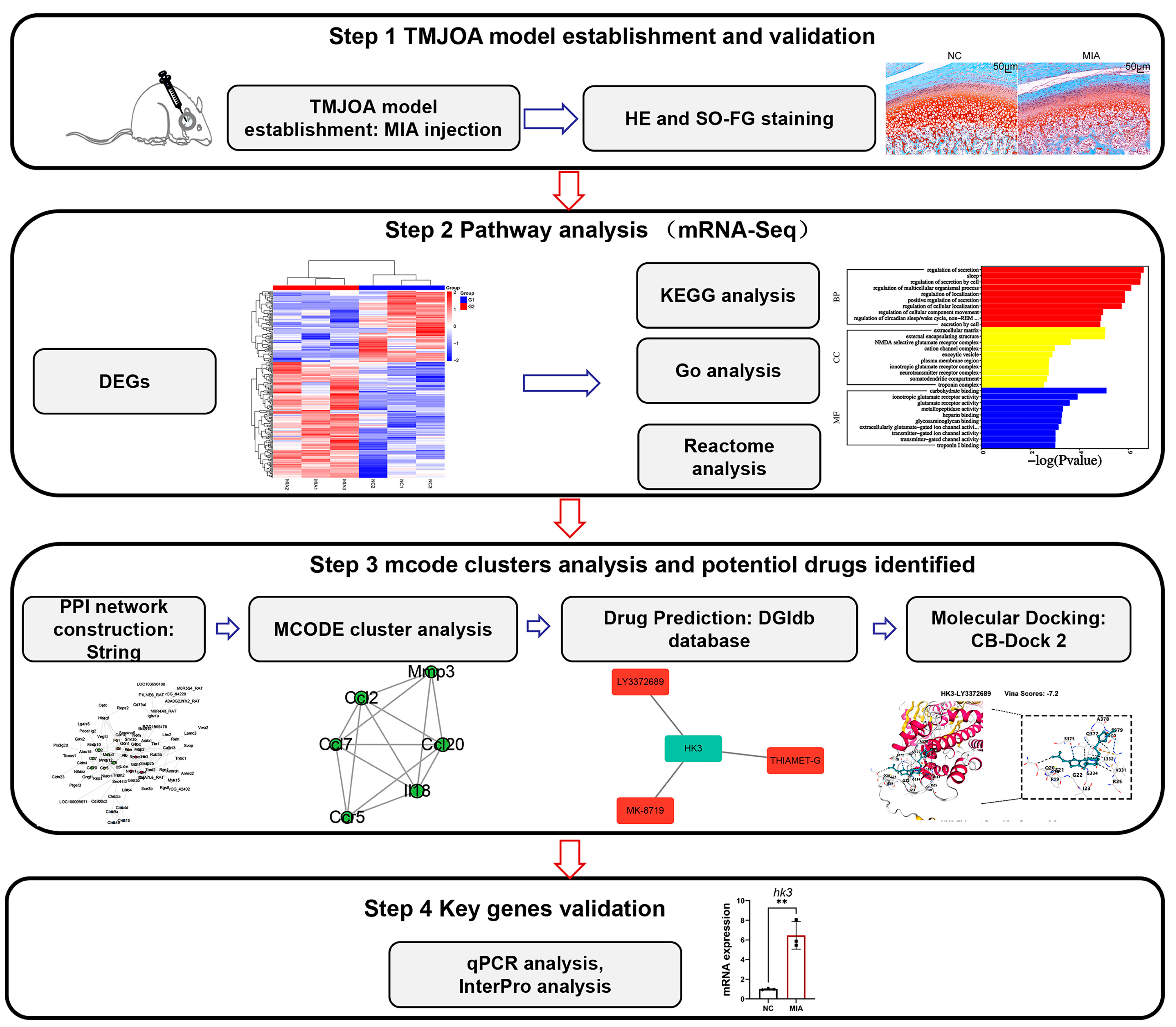 TMJOA is a chronic condition marked by cartilage degradation and synovial inflammation, with current treatment options offering limited effectiveness [15]. Despite its prevalence, the precise pathogenesis of TMJOA remains elusive, underscoring the urgent need to identify target genes implicated in its progression and to develop targeted therapeutic strategies. High-throughput sequencing and bioinformatics analysis have become powerful tools for uncovering key genes involved in TMJOA development [16]. Moreover, drug repurposing presents a promising avenue for rapidly identifying suitable medications and aiding in TMJOA treatment [17]. In this study, we employed RNA sequencing of articular cartilage to elucidate the molecular mechanisms underlying TMJOA.