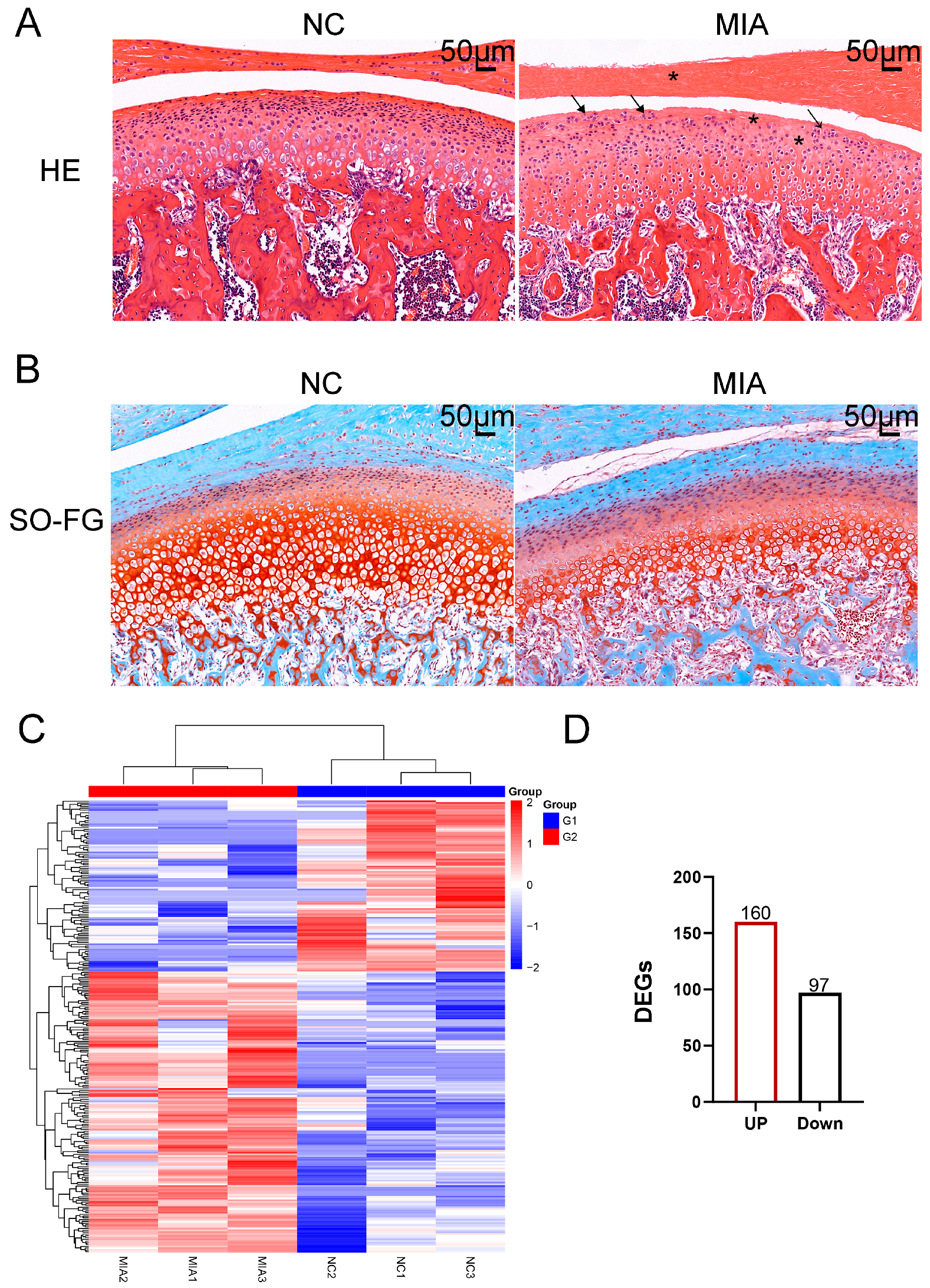 Figure 2. Establishment of the TMJOA Model. (A) HE staining. Asterisks represent cell reduction; arrows represent chondrocyte clustering. (B) Safranin O and Fast Green staining (SO-FG staining). (C) A hierarchical clustering dendrogram was constructed for articular cartilage samples, based on the expression profiles of DEGs. The color scale illustrates normalized expression levels, with red denoting high expression and blue indicating low expression. Each column represents an individual animal, where G1 corresponds to the NC group and G2 to the MIA-induced group. (D) Up-regulated genes are marked in red and down-regulated genes in black, and a total of 160 up-regulated and 97 down-regulated transcripts were detected.