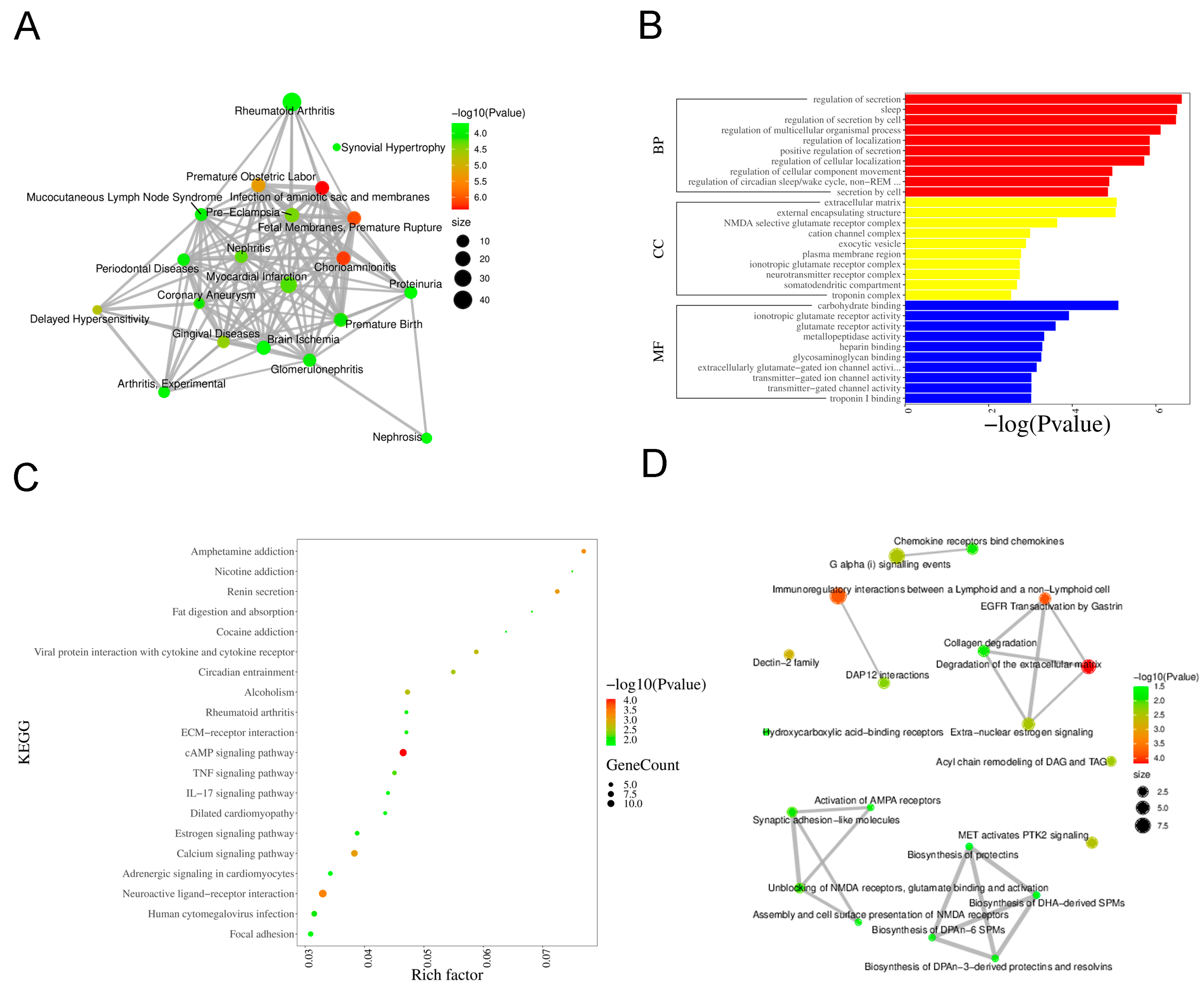 Figure 3. Bioinformatics Analysis Key Pathways in DEGs. (A) Based on the sorting information of −Log10 (p-value), display the top 20 Diseases. The size of the nodes represents the total number of candidate genes belonging to the Disease. (B) GO enrichment analysis. (C) KEGG pathway enrichment analysis. (D) Reactome pathway analysis.