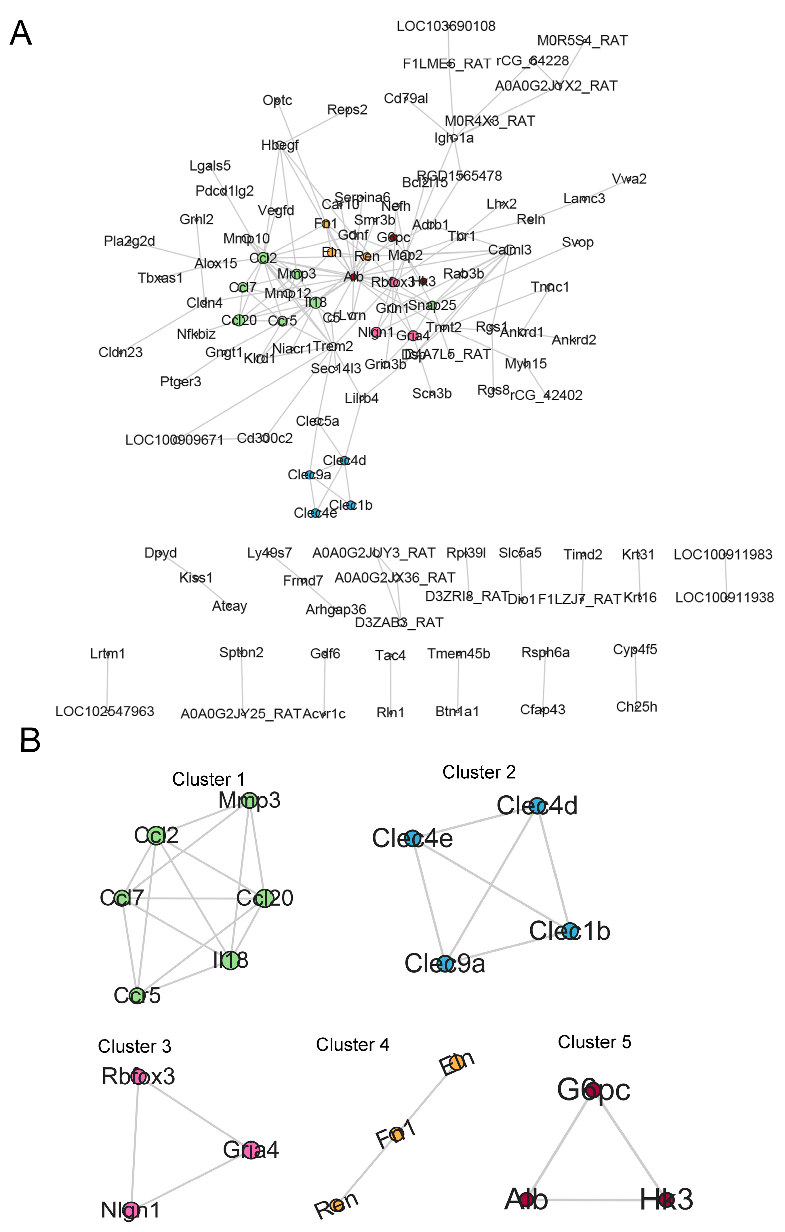 The PPI network of 257 DEGs was constructed using the STRING online database (https://string-db.org, accessed on 20 October 2025) with a confidence score threshold of 0.4. The resulting network was then visualized in Cytoscape. Figure 4A displays the 118 most strongly connected proteins. The 118 DEGs were then clustered using MCODE, and the top five clusters of genes are presented in Figure 4B. Cluster 1 was predominantly enriched with immune-related transcripts, including Ccl2, Ccl7, Ccl20, Ccr5, Il18, and Mmp3. Cluster 5 contained metabolic regulators such as Hk3, Alb, and G6pc, while clusters 2–4 comprised genes encoding C-type lectins (Clec1b, Clec4d, Clec9a, Clec4e), glutamate receptors (Gria4), synaptic proteins (Nlgn1, Rbfox3), and extracellular matrix components (Eln, Fn1, Ren).