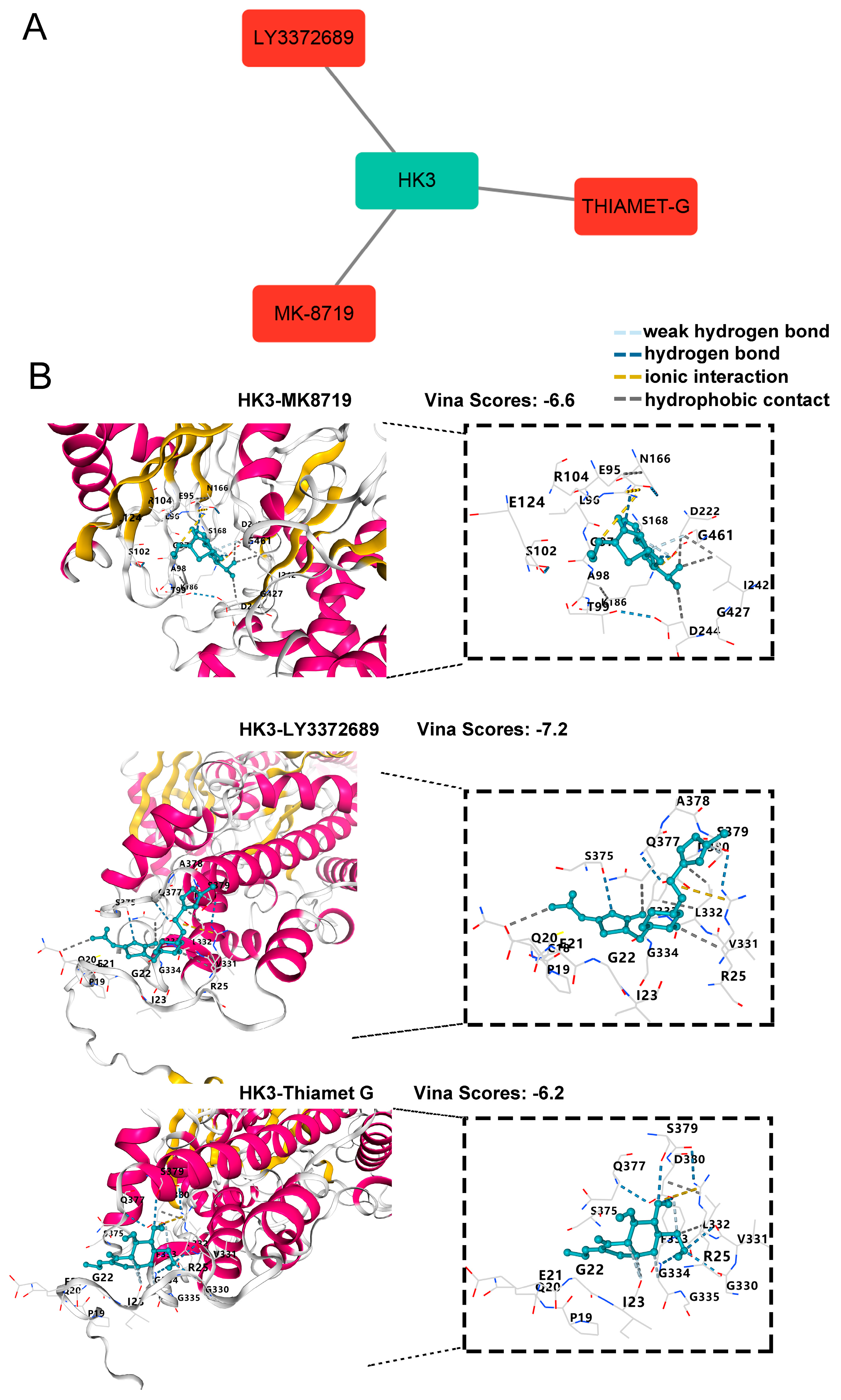 Figure 6. Identification and Validation of HK3-targeting Drugs. (A) Candidate drugs targeting HK3 from the Drug-Gene Interaction Database (DGIdb), visualized using Cytoscape. (B) Molecular docking simulations were conducted using CB-Dock2. The 3D binding models of MK-8719, LY3372689, and Thiamet-G in complex with HK3 are shown; the pose with the highest Vina score is displayed for each compound. In the interaction diagrams, green dashed lines represent hydrogen bonds, yellow lines denote ionic interactions, and gray lines indicate hydrophobic contacts.
