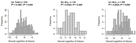 The colony sizes of M.a. and M.w. showed a wide distribution. The colony size of M.a. in Dianchi Lake ranged from 0.0003 mm3 to 0.07 mm3, and that of M.w. ranged from 0.0001 mm3 to 0.08 mm3. The sizes of Microcystis colonies collected from Dianchi Lake were tested using the Shapiro–Wilk test. The results showed that the colony sizes of total Microcystis, M.w., and M.a. conformed to lognormal distribution (Figure 2, Shapiro–Wilk, p > 0.05) rather than a normal distribution (Figure 2, Shapiro–Wilk, p < 0.001).