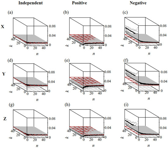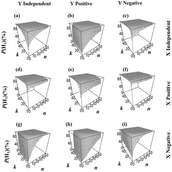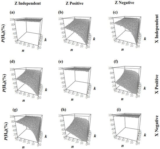 Figure 7. The proportion of accepting H1: R T X < R T Y in permutation tests upon two populations that had different RT via sampling Plan(n,k) ( R T X < R T Y , α = 0.05). (a): the sizes and ratios in population X and Z were both independent; (b): the sizes and ratios in population X were independent and in population Z were positively correlated; (c): the sizes and ratios in population X were independent and in population Z were negatively correlated; (d): the sizes and ratios in population X were positively correlated and in population Z were independent; (e): the sizes and ratios in population X and Z were both positively correlated; (f): the sizes and ratios in population X were positively correlated and in population Z were negatively correlated; (g): the sizes and ratios in population X were negatively correlated and in population Z were independent; (h): the sizes and ratios in population X were negatively correlated and in population Z were positively correlated; (i): the sizes and ratios in population X and Z were both negatively correlated.