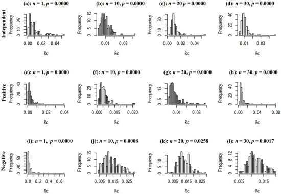 Figure 4. The histogram of RC via sampling Plan(n,150). P presents the significance of the Shapiro–Wilk test. (ad) Ratio and reference were independent. (eh) Ratio and reference were positively correlated. (il) Ratio and reference were negatively correlated.
