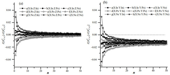 Figure 5. (a): The difference between E R C n , 5 X and E R C n , 5 Z calculated from two populations X and Z that had equal RT via sampling Plan(n,5). (b): The difference between E R C n , 5 X and E R C n , 5 Y calculated from two populations X and Y that had different RT via sampling Plan(n,5). “In” presents the ratio and size as independent. “Po” presents the ratio and size as positively correlated. “Ne” presents the ratio and size that were negatively correlated.