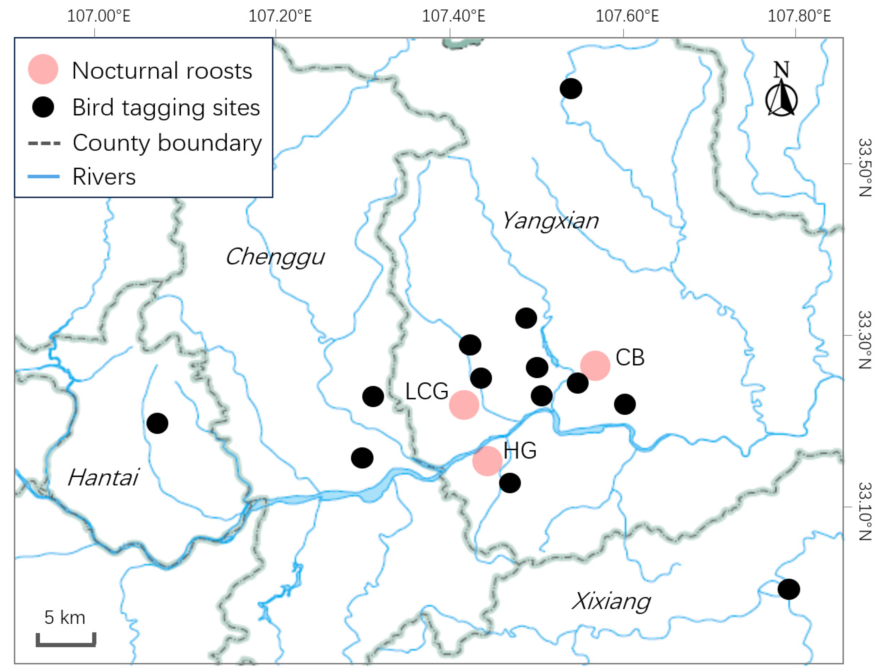 - Lei, Y.; Xu, X.; Ye, Y.; Wang, C.; Qing, B.; Duan, W.; Yan, J.; Huang, Y.; Ding, C. From fledging to independence: Post-fledging movements and space use of the Crested Ibis (Nipponia nippon). Avian Res. 2025, 16, 100266. [Google Scholar] [CrossRef]