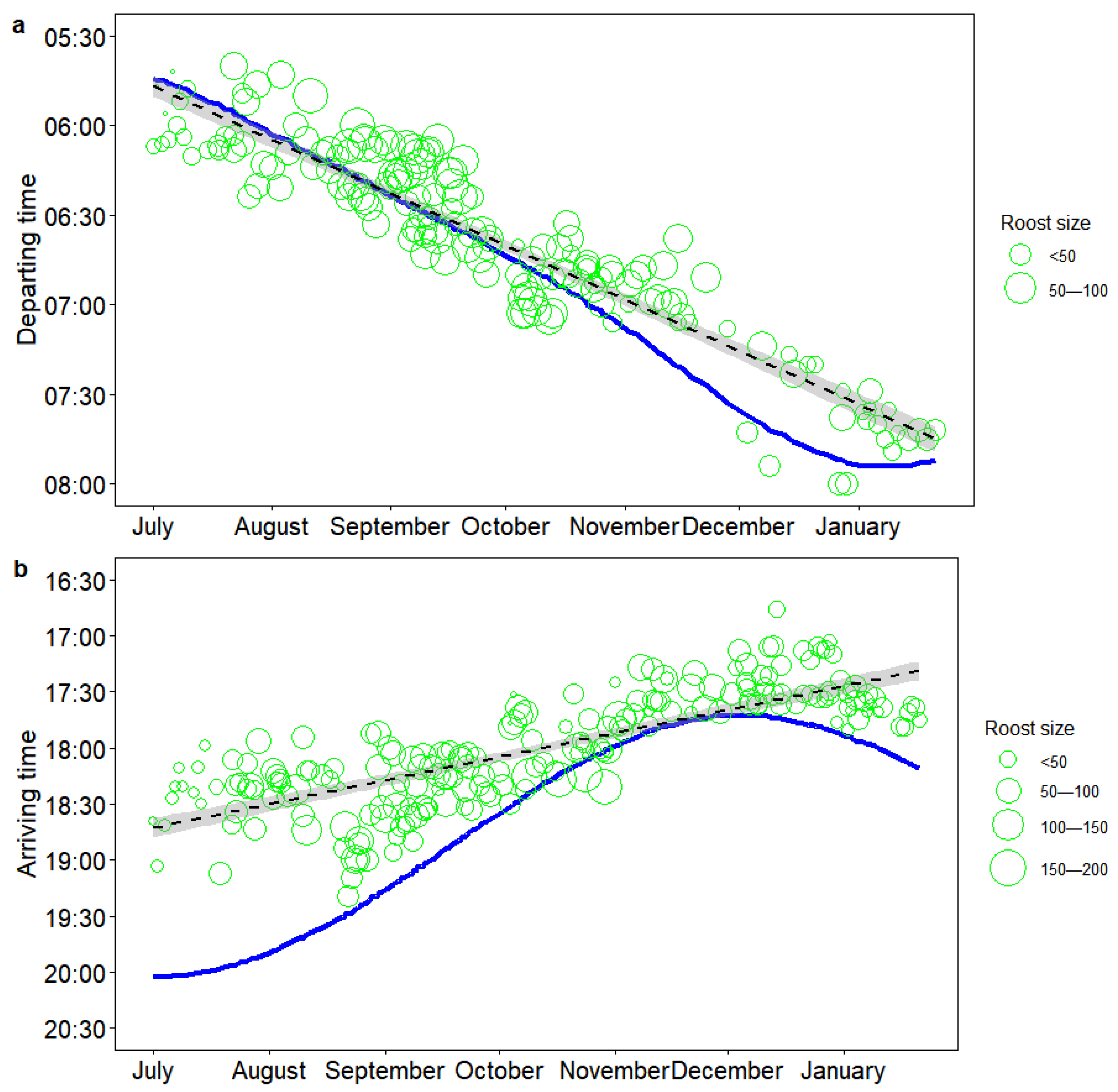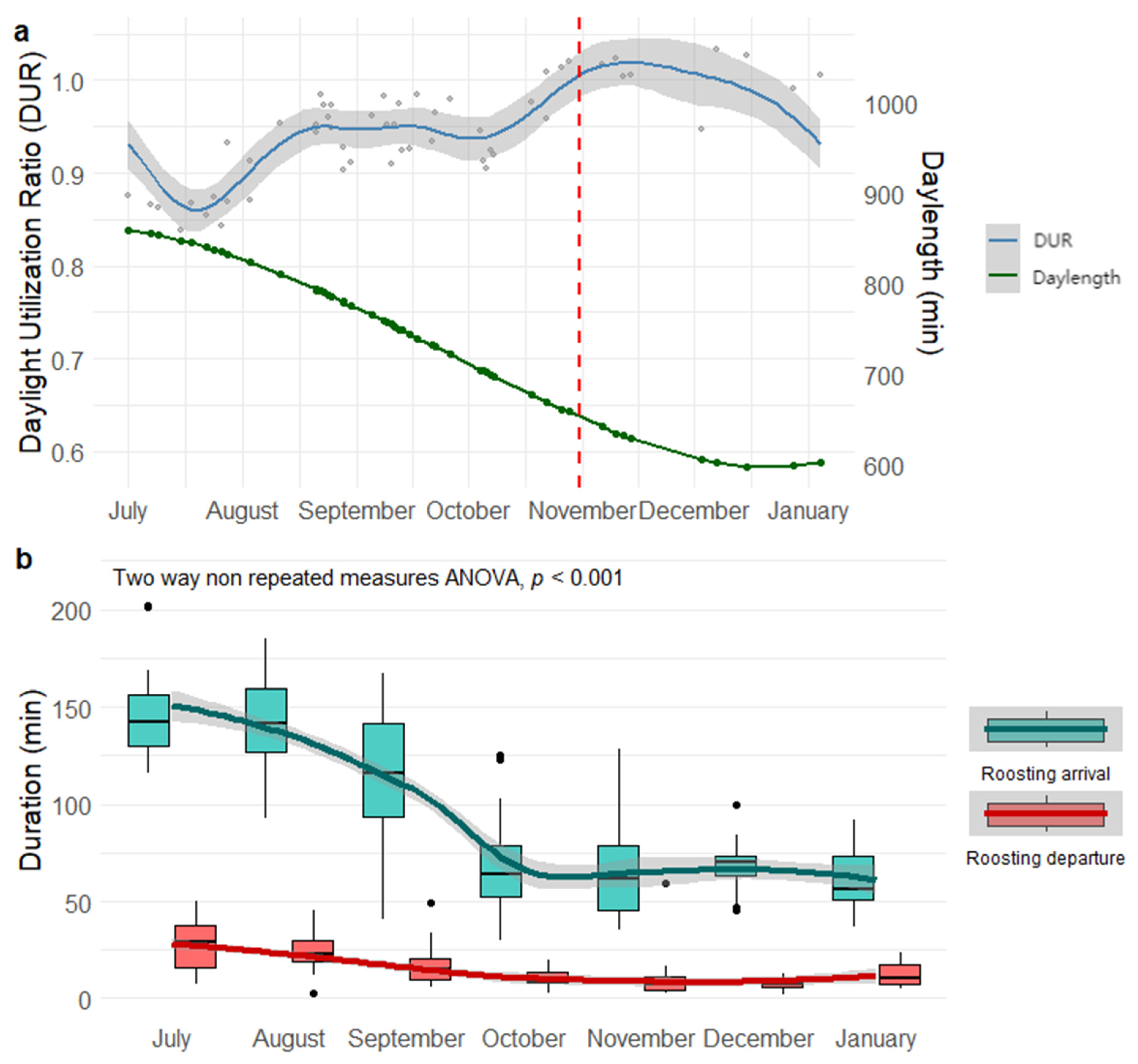 Chicago/Turabian StyleLi, Wei, Dongping Liu, Yuhe Liao, Ke He, and Chao Wang. 2025. "Seasonal Variation in Nocturnal Roost Timing and Diurnal Movement in Endangered Crested Ibis (Nipponia nippon): An Adaptation Strategy to Environmental Changes" Biology 14, no. 11: 1496. https://doi.org/10.3390/biology14111496