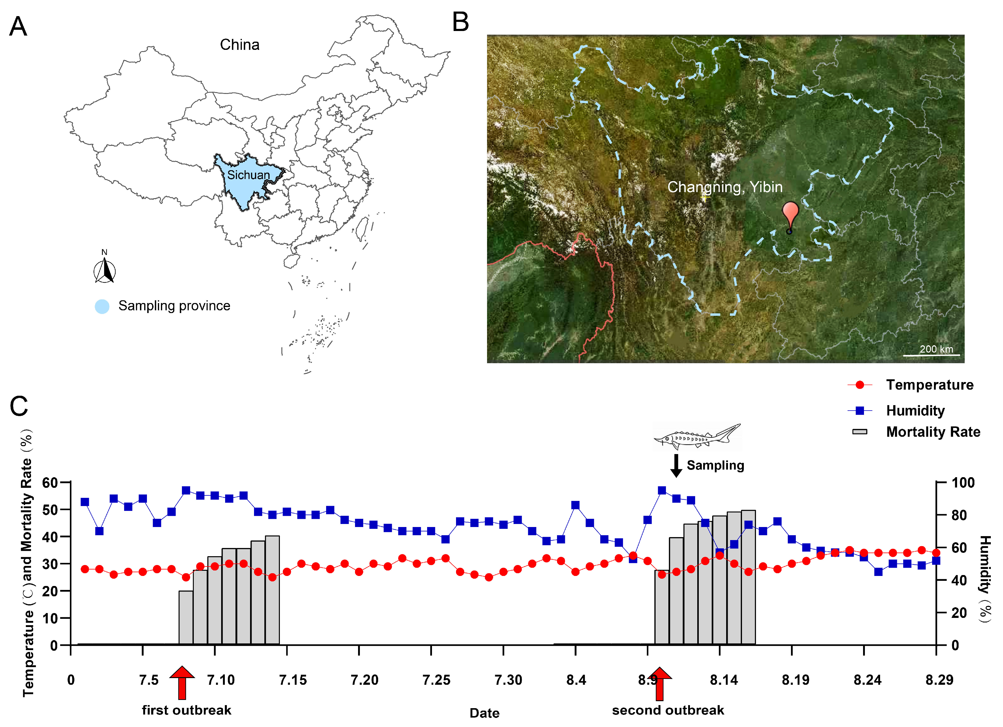 The disease outbreak coincided with severe environmental deterioration, which critically increased the host’s susceptibility to infection. As a cold-water species, the Yangtze sturgeon has an optimal growth temperature of 20–22 °C [