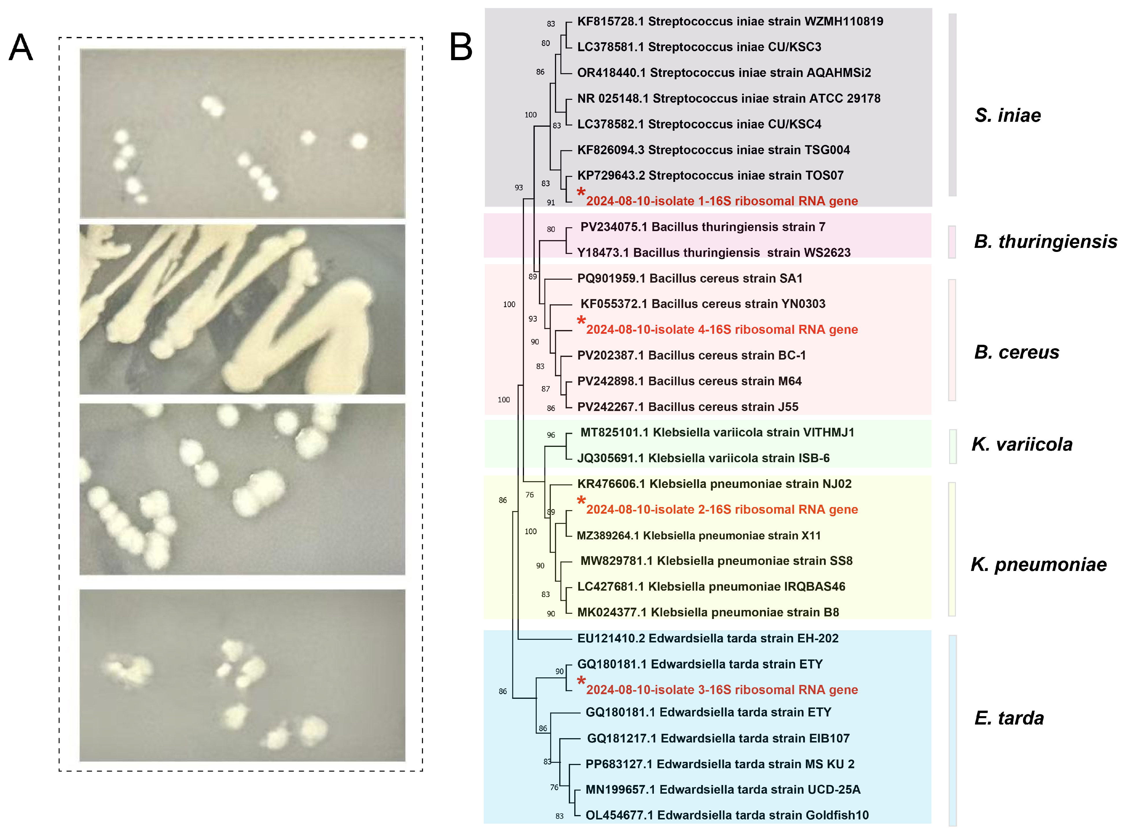 8], the morphological characteristics of the bacteria were observed. Subsequently, the colonies of well-formed and distinct isolated colonies on the LB medium were further selected and re-inoculated on fresh LB medium, and then incubated in a constant temperature incubator at 30 °C for 24 h for purification. Ultimately, 12 single colonies were successfully obtained (3 fish × 4 tissues = 12 isolates).