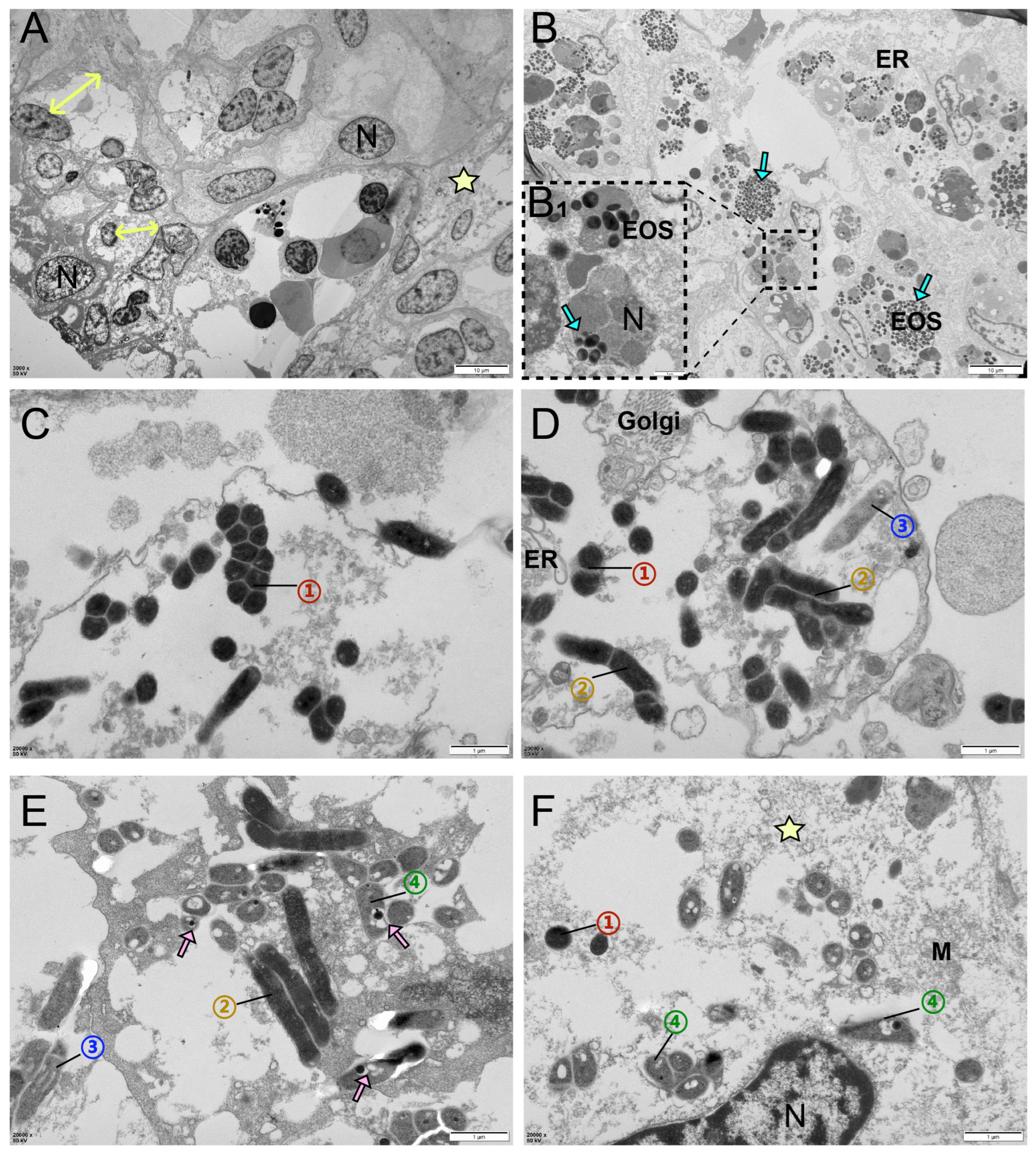 We selected the areas where the accumulation of bacteria was observed, melted the wax within that area and immersed it in pure acetone. Subsequently, the liver, kidney and heart tissues were washed with PBS, fixed with 1% osmic acid, dehydrated with gradient acetone, replaced and embedded. Then, the samples were stained with 1% uranyl acetate for 20 min, rinsed with ddH2O twice, followed by staining with 1% lead citrate for 20 min, and another two washes with ddH2O. Finally, the ultrastructure of the bacteria was observed by HITACH type I transmission electron microscope under 80 kV. Images were captured and collected for subsequent analysis.