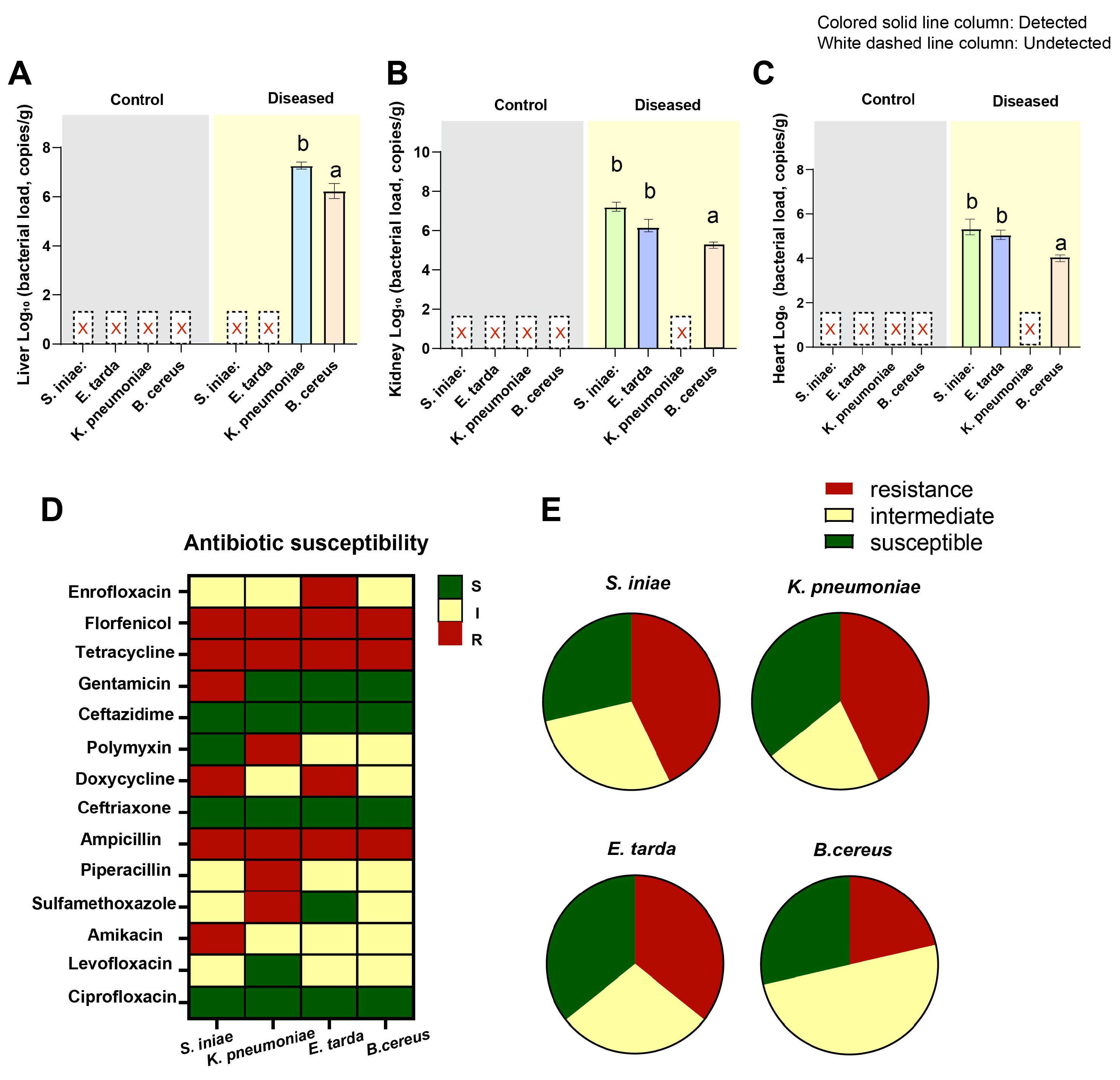 4 copies/μL) of genomic DNA from pure cultures of each target bacterium, with copy numbers calculated based on DNA concentration (measured by Qubit) and bacterial genome size. Total DNA was extracted from liver, kidney, and heart tissues of healthy and diseased sturgeons (50 mg per sample) using a tissue Animal Tissue DNA Isolation Kit (Foregene, Chengdu, China), and adjusted to 10 ng/μL. The qPCR reaction system (20 μL) contained 10 μL SYBR Green qPCR Mix (with ROX reference dye), 0.8 μL of each primer (10 μM), 2 μL template DNA, and 6.4 μL nuclease-free water. Bacterial load (copies/g tissue) was calculated using the standard curve (R