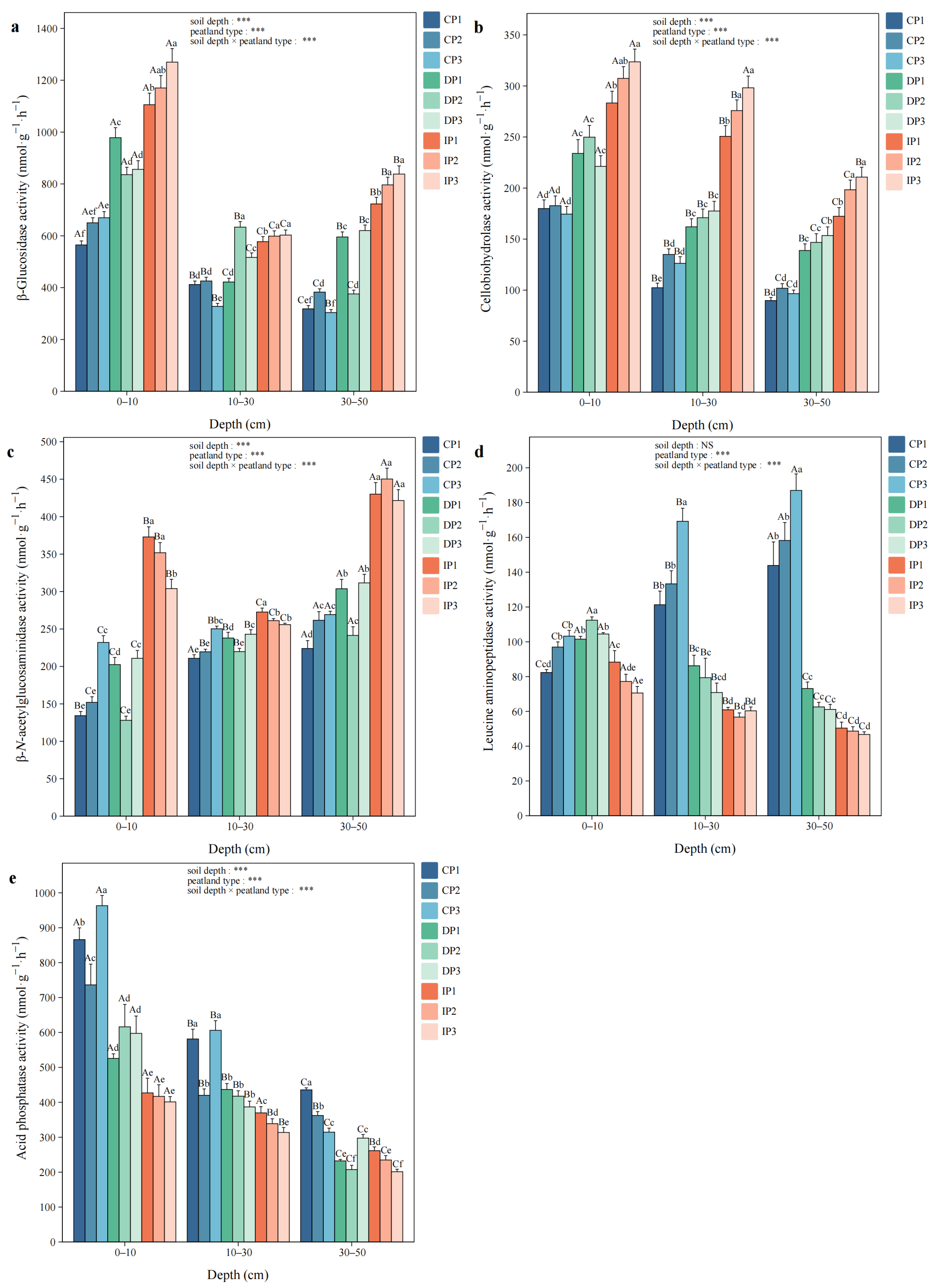 Figure 1. The activities of (a) β-glucosidase (BG), (b) cellobiohydrolase (CBH), (c) β-N-acetylglucosaminidase (NAG), (d) leucine aminopeptidase (LAP), and (e) acid phosphatase (AP). Capital letters indicate significant differences at different soil depths in the same peatland (p < 0.05), and lowercase letters indicate significant differences among different peatlands at the same depth (p < 0.05). Two-way ANOVA was conducted to determine the effects of soil depth, peatland type, and their interactions on soil hydrolytic enzyme activities (*** p < 0.001; NS, non-significant).