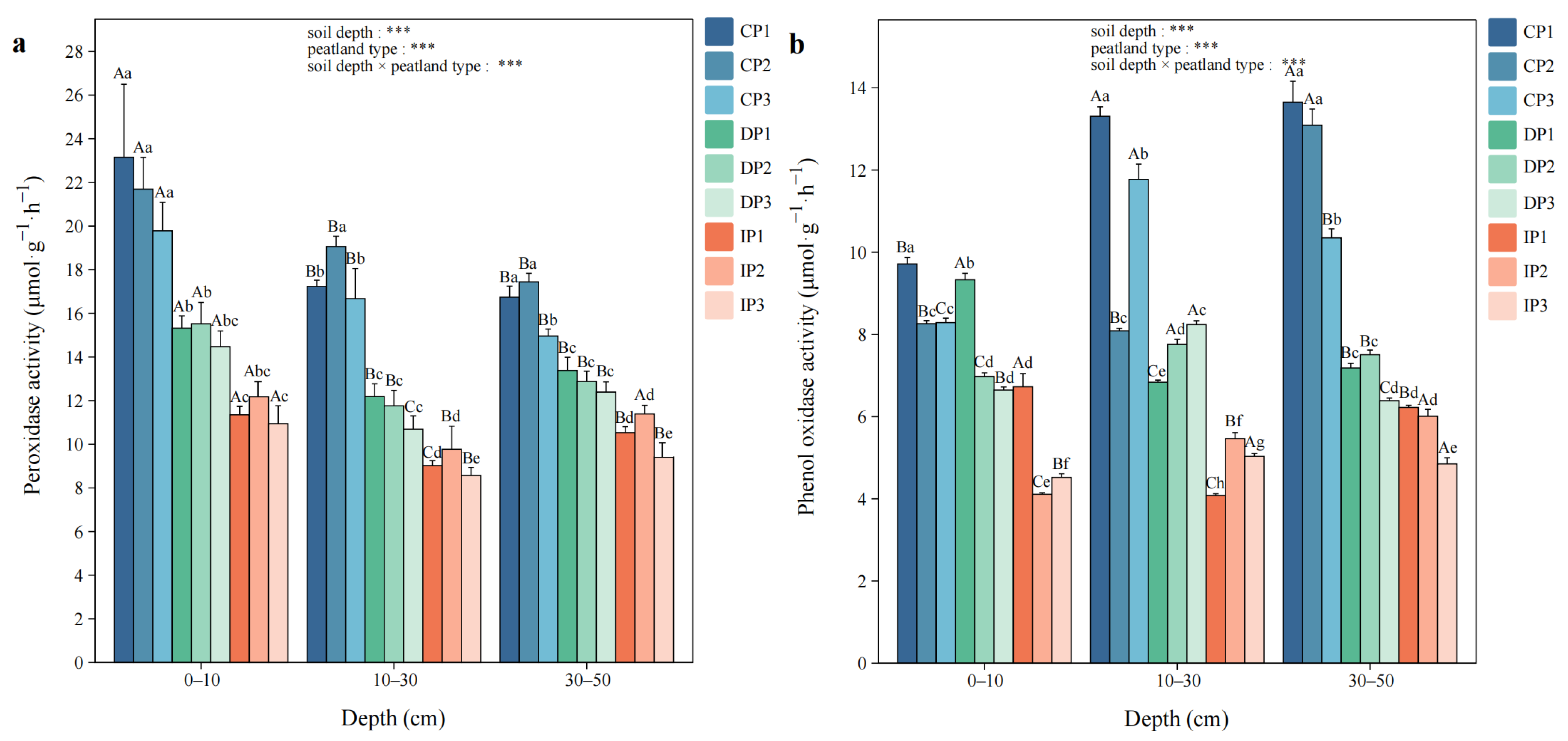 Figure 2. The activities of (a) peroxidase (PER) and (b) phenol oxidase (PHO). Capital letters indicate significant differences at different soil depths in the same peatland (p < 0.05), and lowercase letters indicate significant differences among different peatlands at the same depth (p < 0.05). Two-way ANOVA was conducted to determine the effects of soil depth, peatland type, and their interactions on soil oxidative enzyme activities (*** p < 0.001).