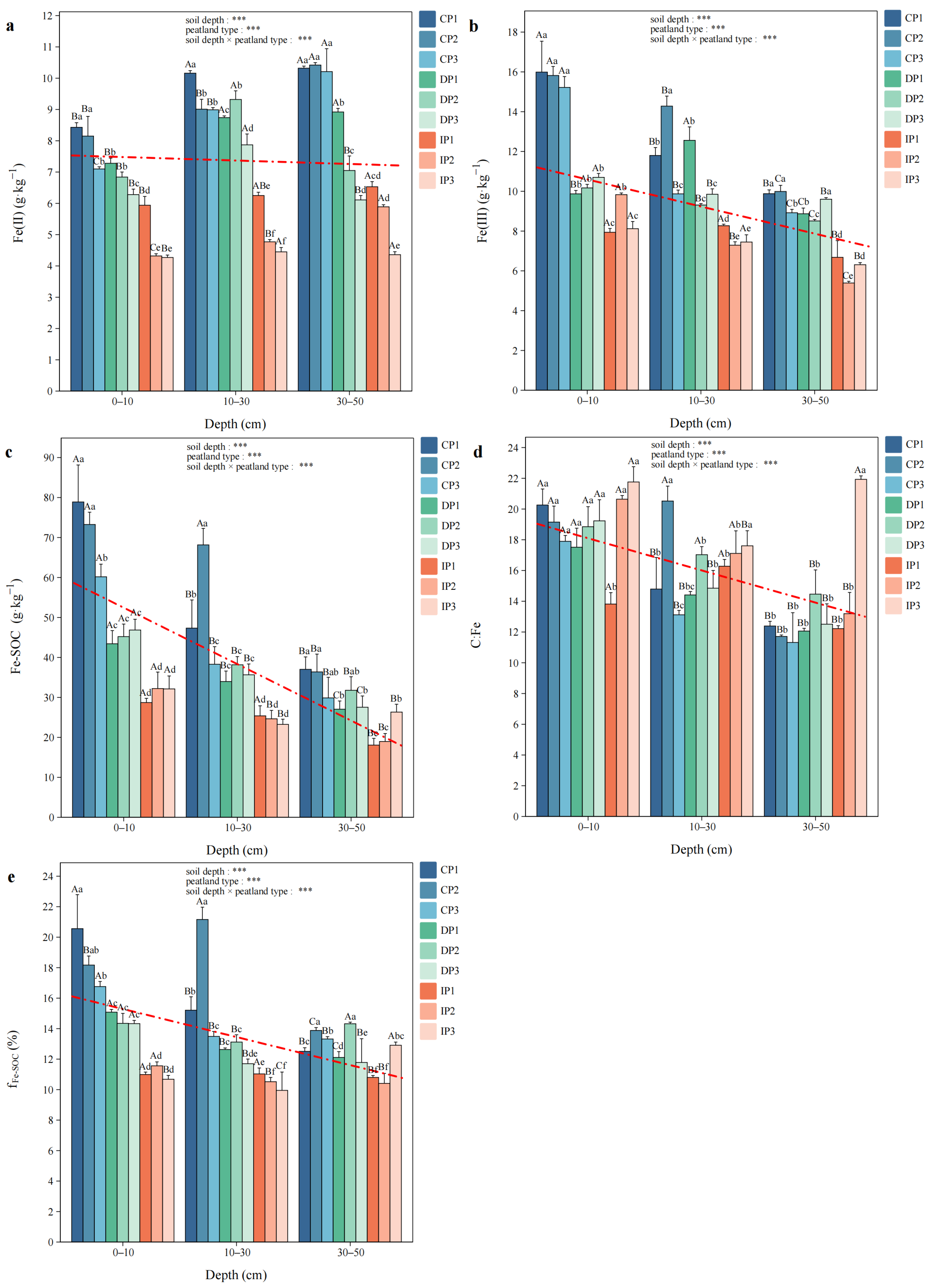 Figure 3. The contents of (a) ferrous iron (Fe(II)), (b) ferric iron (Fe(III)), (c) iron-bound soil organic carbon (Fe-SOC), (d) the C:Fe molar ratio, and (e) the proportion of Fe-SOC in total soil SOC (fFe-SOC). Capital letters indicate significant differences at different soil depths in the same peatland (p < 0.05), and lowercase letters indicate significant differences among different peatlands at the same depth (p < 0.05). Two-way ANOVA was conducted to determine the effects of soil depth, peatland type, and their interactions on Fe and C coupling (*** p < 0.001). The red dashed lines show linear trends.
