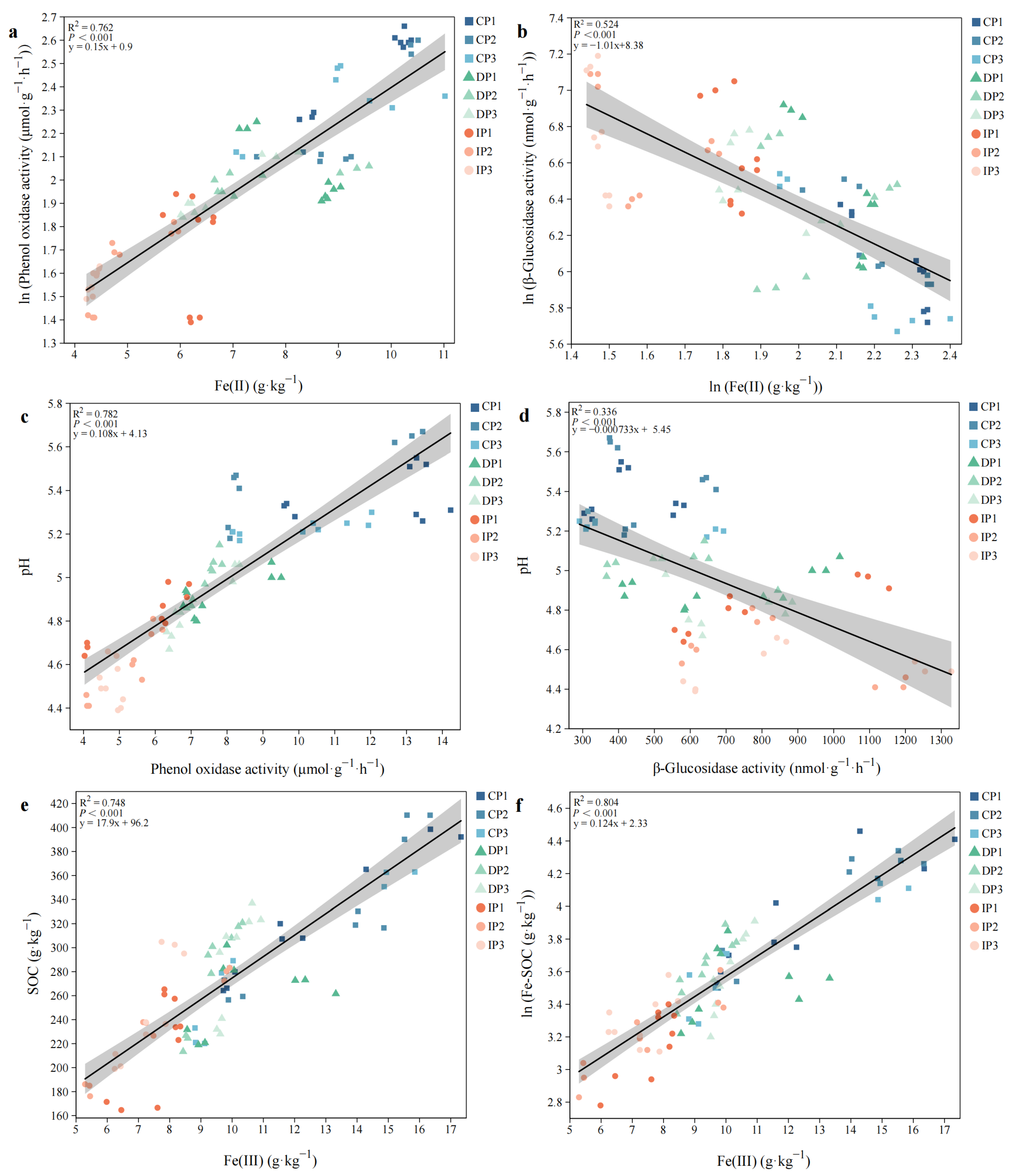 Linear regression analysis showed that there was a highly significant positive correlation between Fe(II) and PHO activity (R2 = 0.762, p < 0.001, Figure 5a), PHO activity and pH (R2 = 0.782, p < 0.001, Figure 5c), Fe(III) and SOC (R2 = 0.748, p < 0.001, Figure 5e), as well as between Fe(III) and Fe-SOC (R2 = 0.815, p < 0.001, Figure 5f). By contrast, a negative correlation was observed between Fe(II) and BG activity (R2 = 0.524, p < 0.001, Figure 5b), BG activity and pH (R2 = 0.336, p < 0.001, Figure 5d).