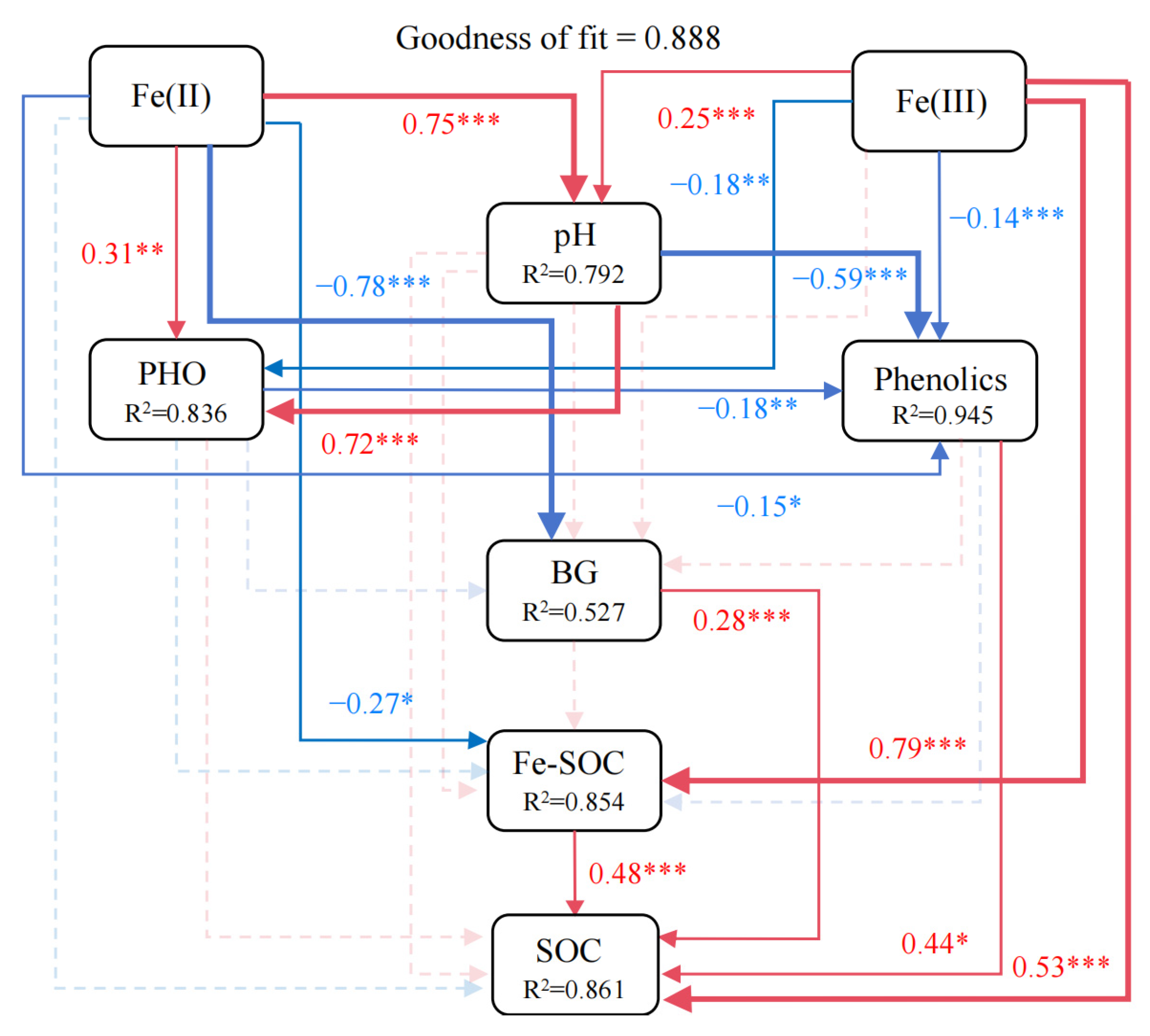 The PLS-PM analysis revealed that Fe(III), Fe-SOC, phenolics, and BG activity showed direct positive effects on SOC (coefficients = 0.53, 0.48, 0.44, and 0.28, respectively, p < 0.05, Figure 6). Fe(II) exhibited a significant positive association with PHO activity (p < 0.01). Fe(II) had no direct effect on SOC but an indirect effect on SOC via BG activity, Fe-SOC and phenolics. Fe(II) exhibited a significantly negative direct effect on Fe-SOC (coefficients = −0.27, p < 0.05), whereas Fe(III) exhibited a significantly positive direct effect (coefficients = 0.79, p < 0.001). Additionally, pH was markedly positively associated with PHO activity (p < 0.001). PHO activity had a significantly negative direct effect on phenolics (coefficients = −0.18, p < 0.01). Phenolics had no direct effect on BG activity.