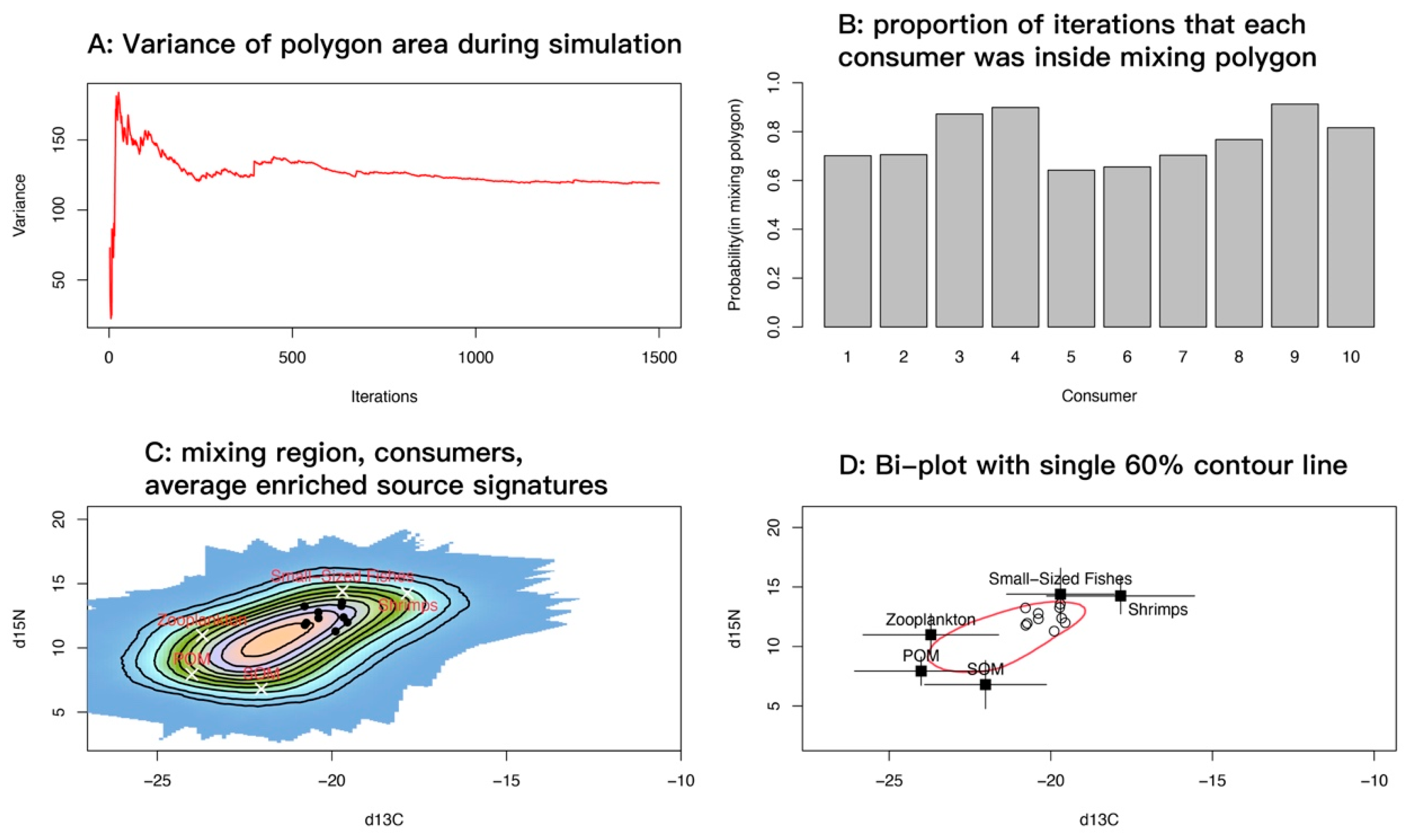 - Parnell, A.C.; Inger, R.; Bearhop, S.; Jackson, A.L. Source partitioning using stable isotopes: Coping with too much variation. PLoS ONE 2010, 5, e9672. [Google Scholar] [CrossRef]