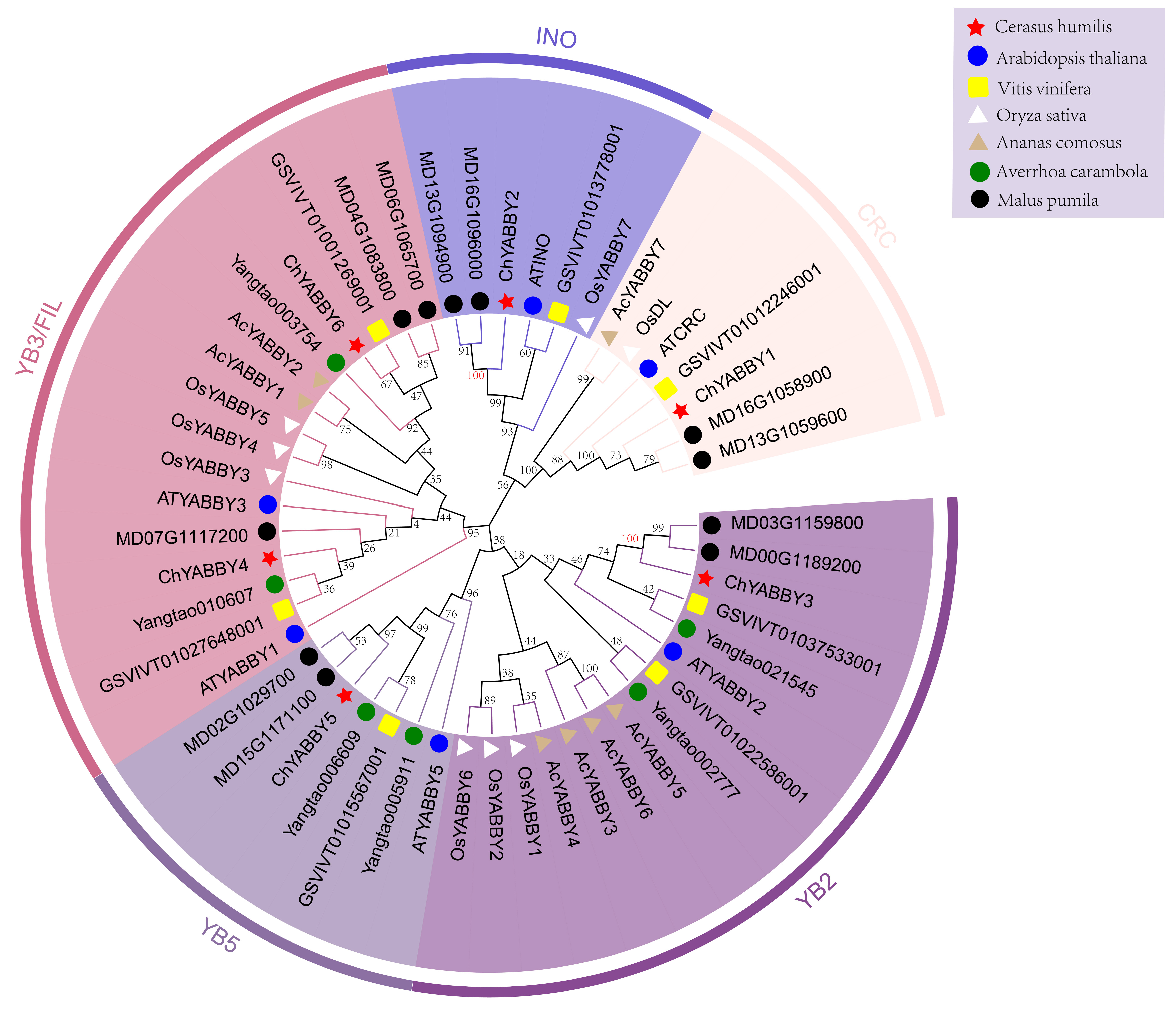 - Li, C.; Dong, N.; Shen, L.; Lu, M.; Zhai, J.; Zhao, Y.; Chen, L.; Wan, Z.; Liu, Z.; Ren, H.; et al. Genome-wide identification and expression profile of YABBY genes in Averrhoa carambola. PeerJ 2022, 9, e12558. [Google Scholar] [CrossRef]
